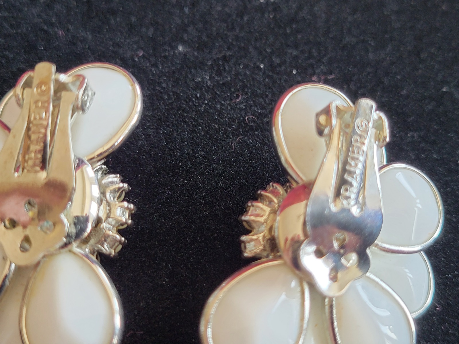 Kramer Milk Glass Vintage clip on earrings in a floral design set in silver tone metal