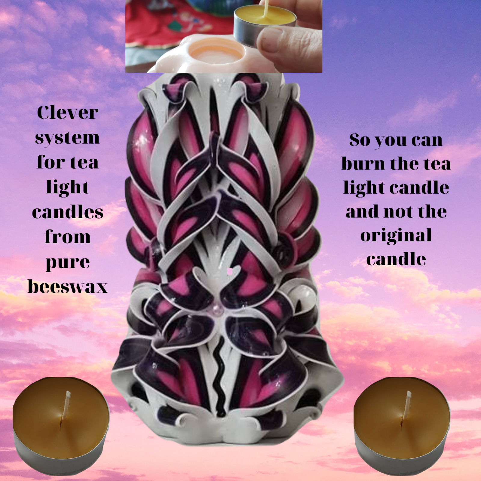 The handmade carved candles With Cleaver Base For Tealight are made of paraffin and colored with vibrant, non-toxic pigments, specially formulated for use with paraffin. The finished candles are covered with a water-based candle lacquer to produce a scratch and dust resistant, beautiful, high-gloss finish.Your carved candles are packed securely.