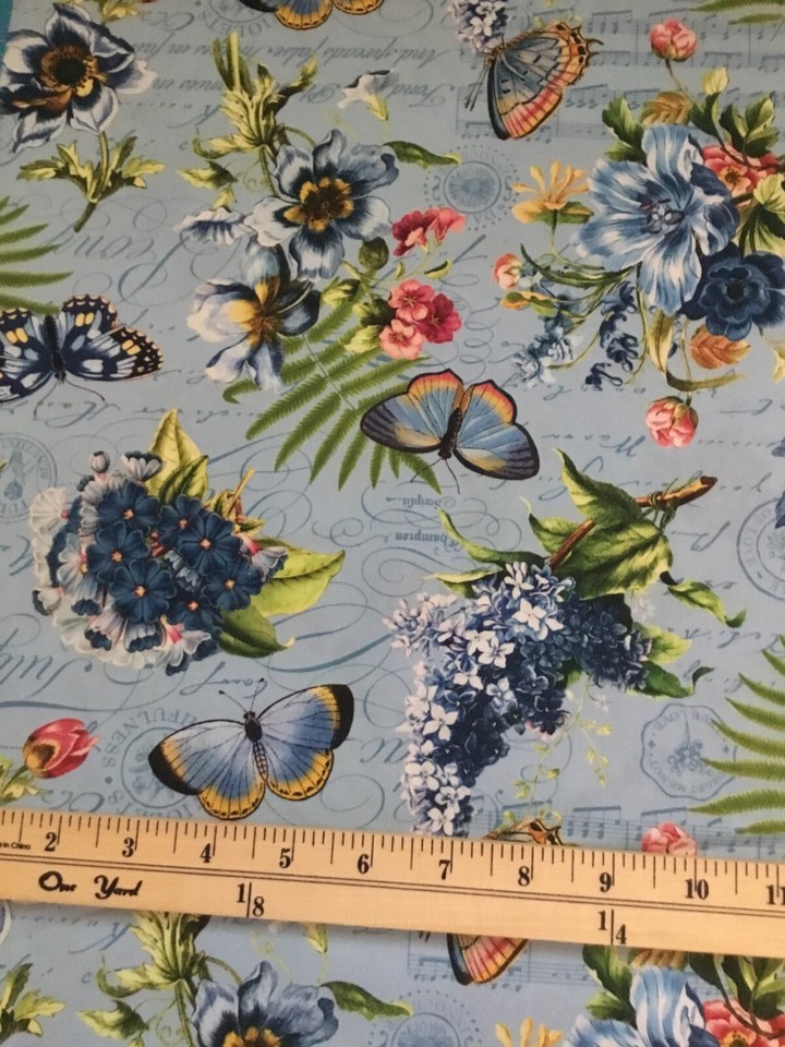Something Blue designed by Tina Higgins for Northcott Fabrics features colorful butterflies and floral bouquets all on a medium blue background