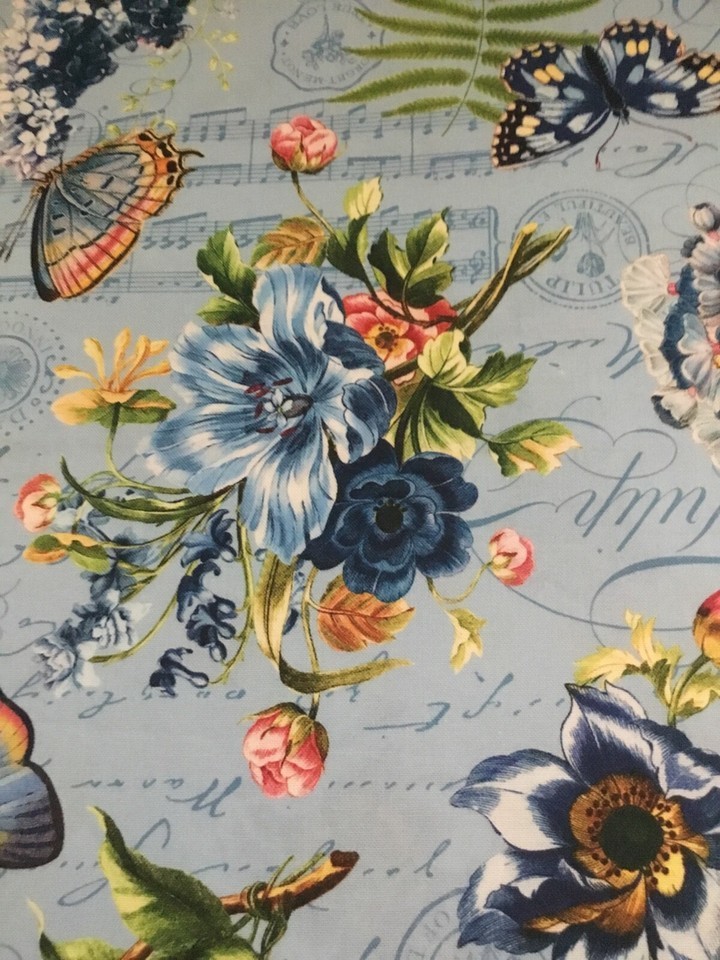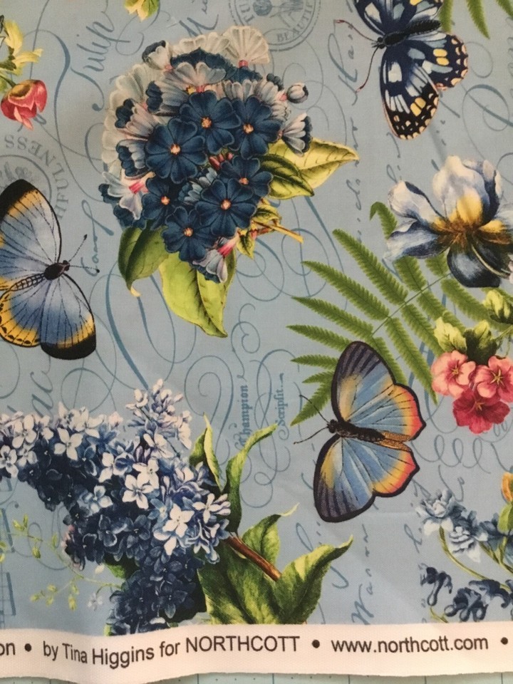 Northcott - Something Blue by Tina Higgins Butterflies & Bouquets on Blue 1/2 yd