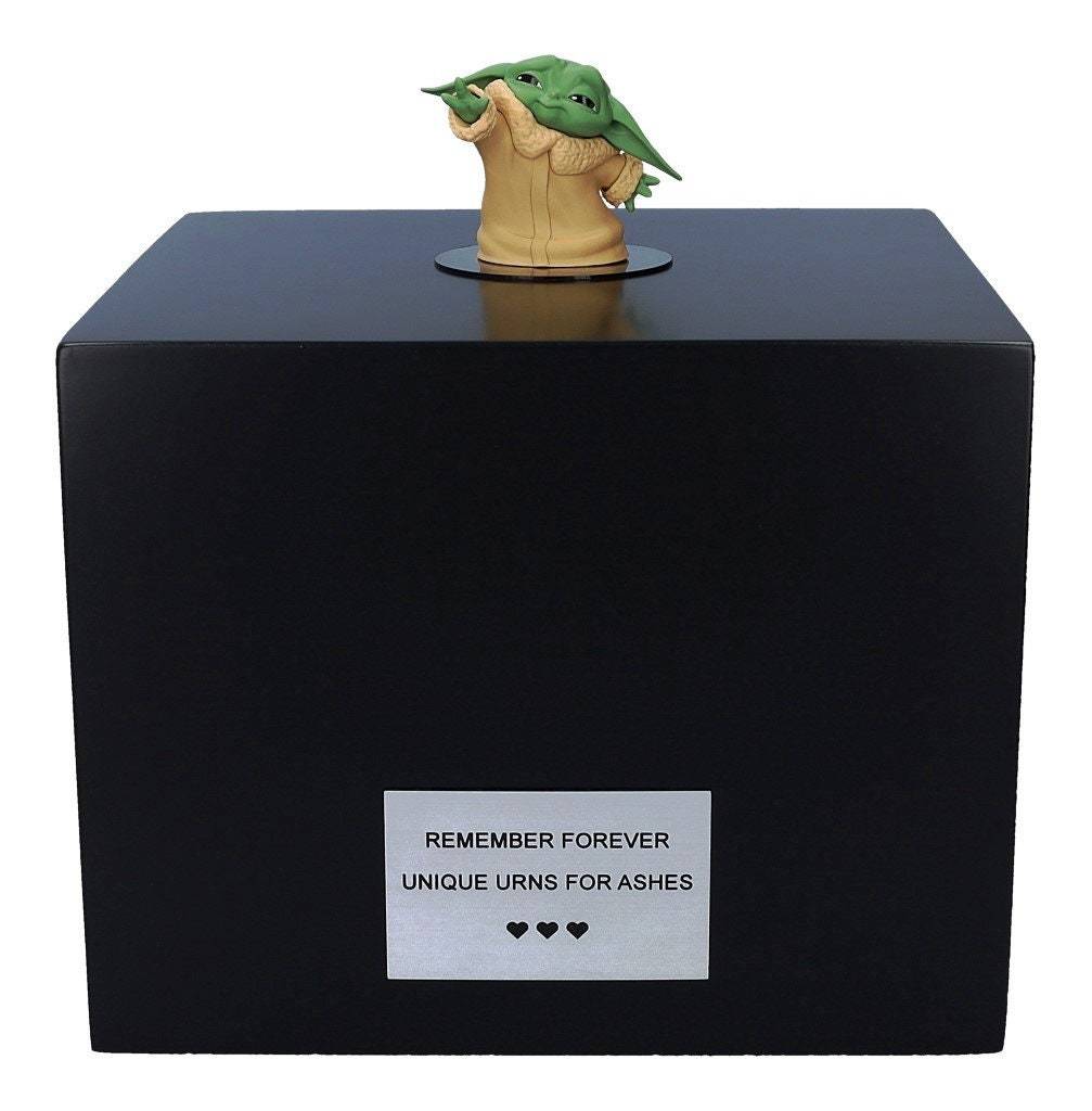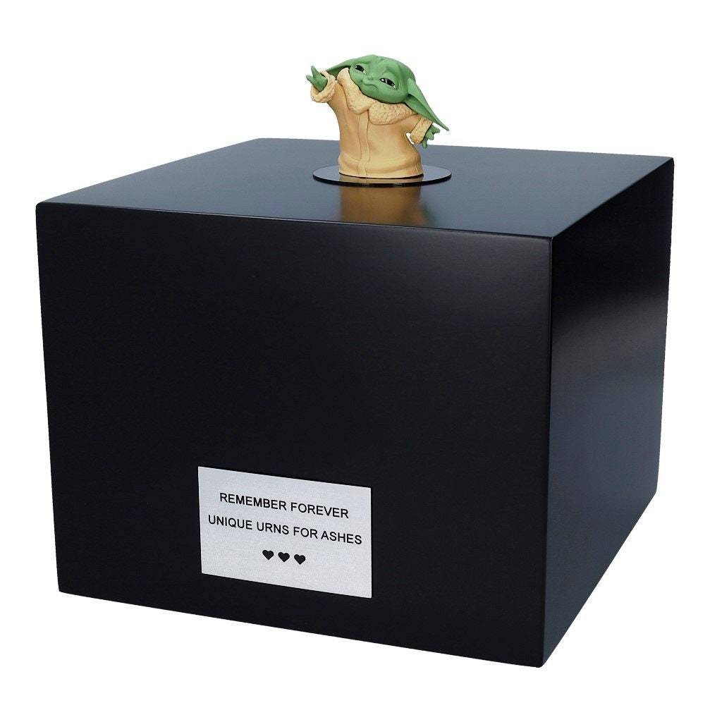 ? Introducing the Galaxy Guardian Baby Yoda Cremation Urn ? a heartfelt tribute to honor the memory of your loved one in a truly extraordinary way. Crafted with utmost care and artistry. This star wars elegant black wooden urn features a delicate and endearing Baby Yoda figurine gracing its top.