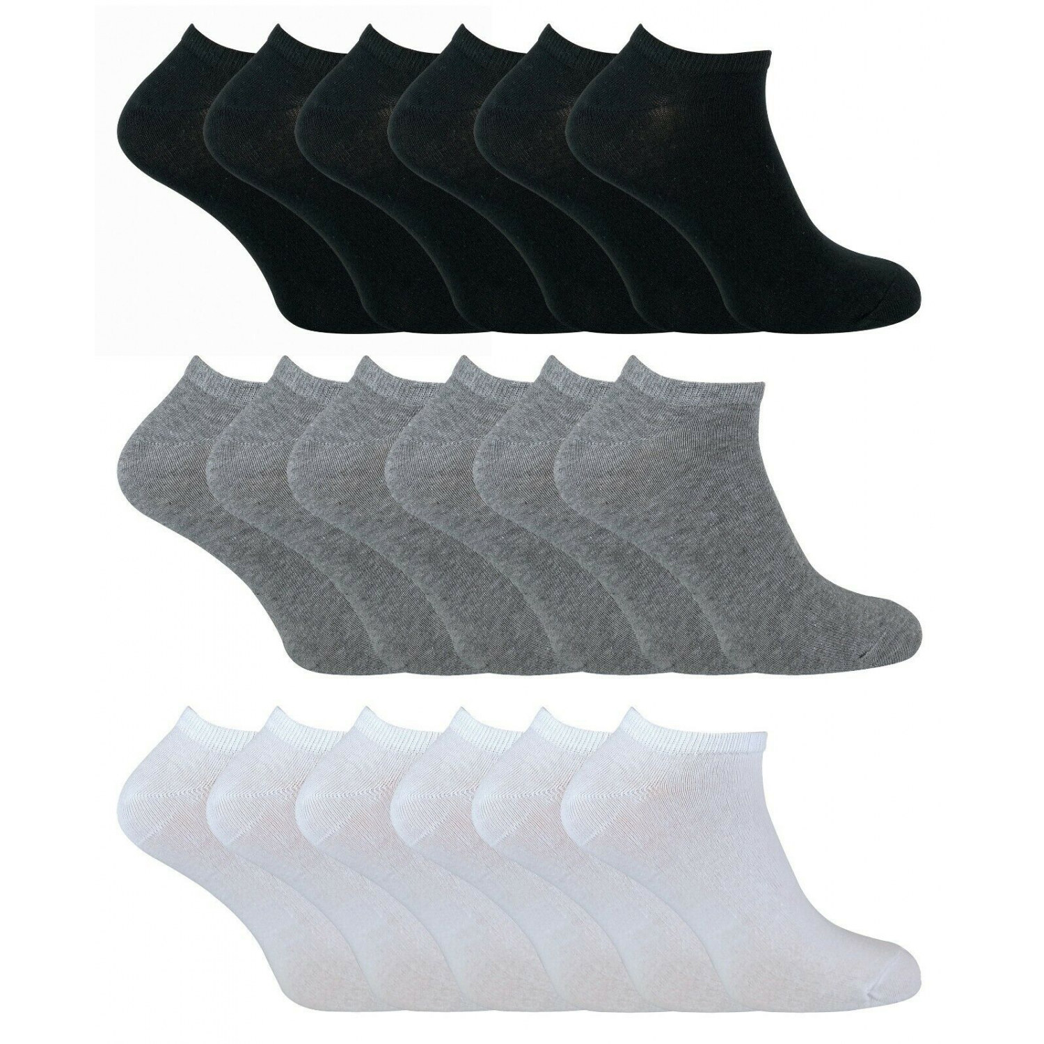Unisex No Show Low Cut Ankle Socks - also called trainer socks Blend of Cotton, Polyester and Spandex 6-Pack Color: Mix of white, gray and black. Fits shoe size 5 to 11. Please note: These socks are in OEM packaging, that is you simply get the socks in a plain bag with no fancy retail packaging.