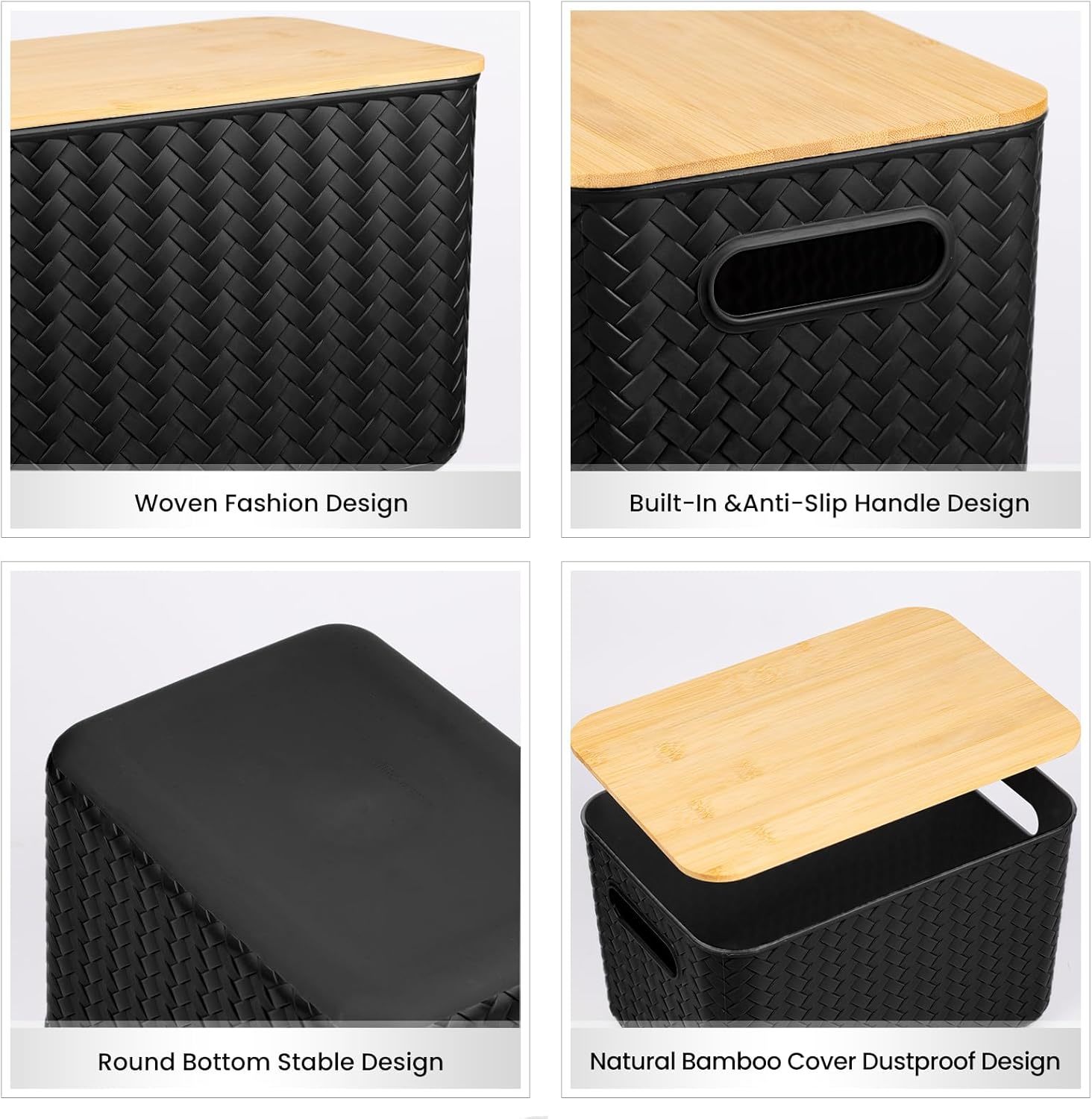 4 Packs Storage Bins With Bamboo Lids - Plastic Storage Containers With, Black