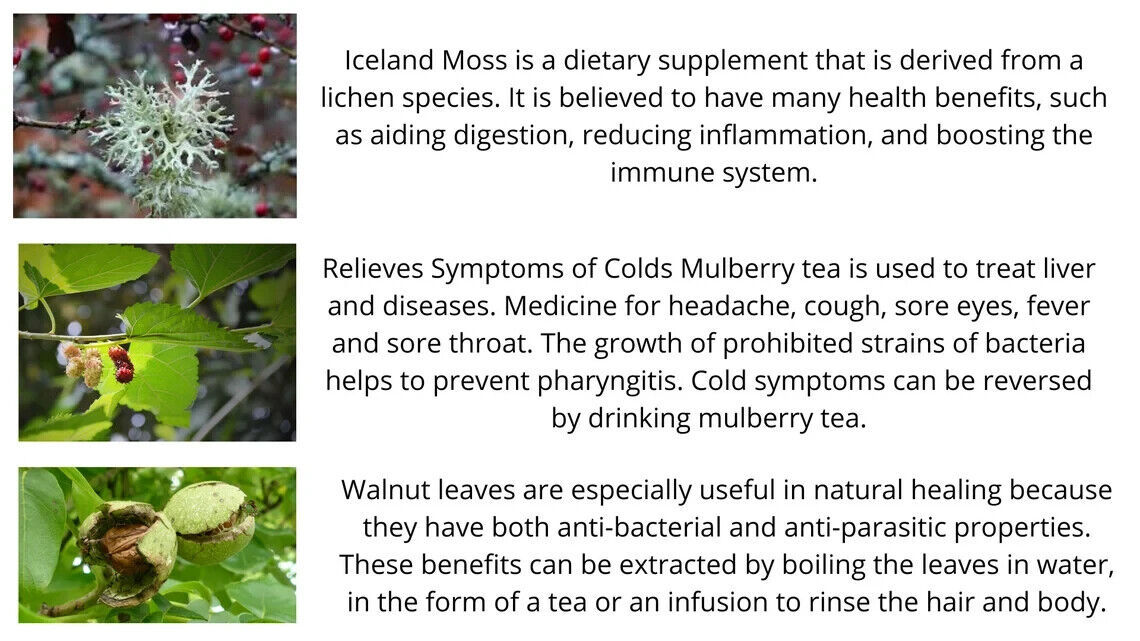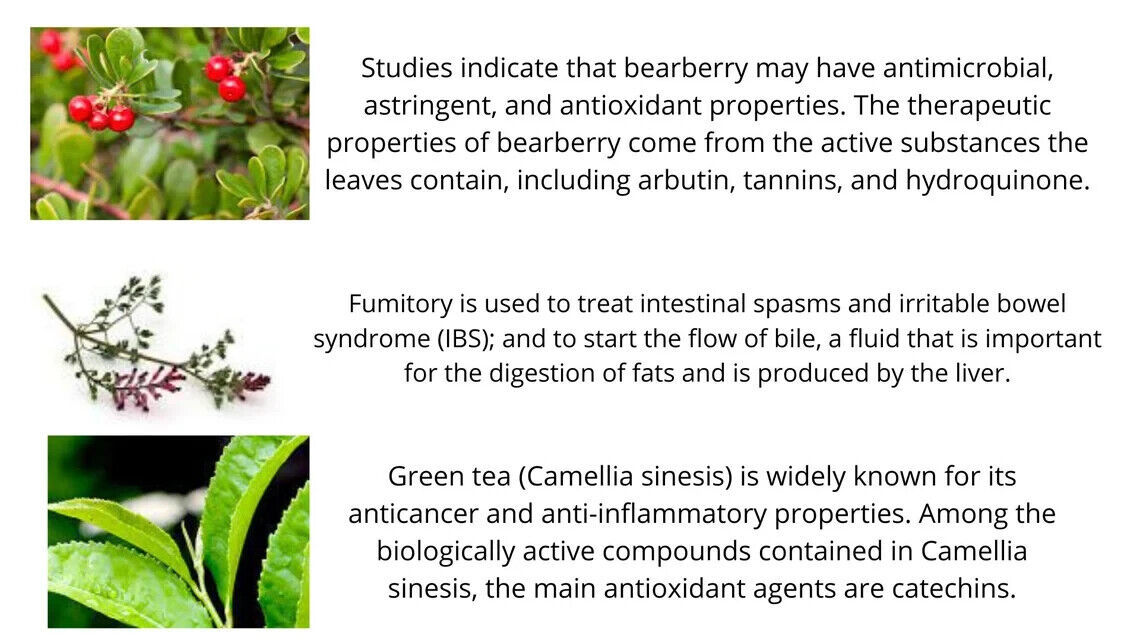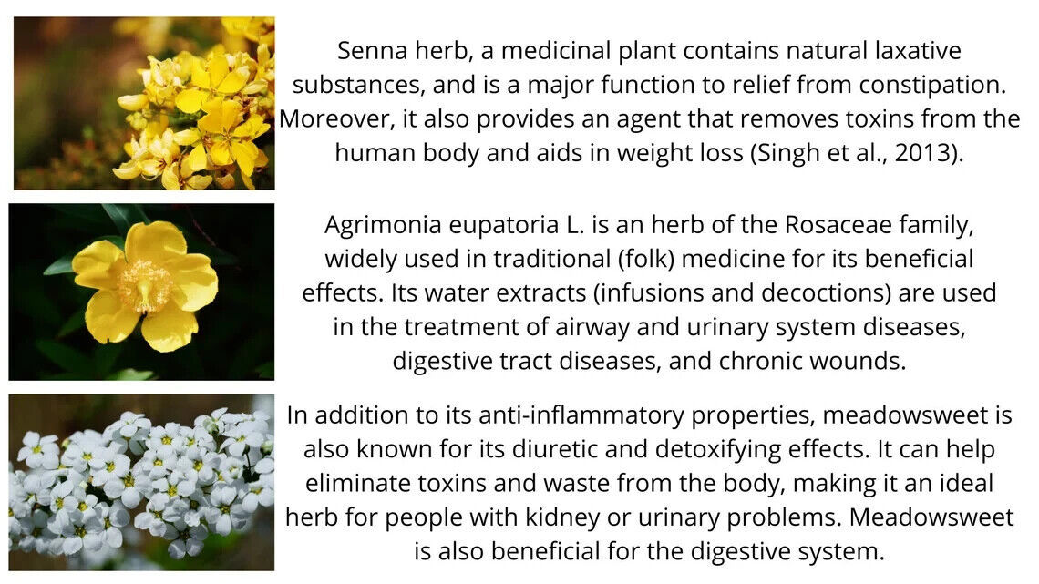 We offer you a first-class selection of the most effective cleansing herbs: Agrimony, Meadowsweet, Icelandic moss, Mulberry leaves, Walnut leaves, Bearberry, Fumitory, Green tea, Rose petals, Natural jasmine aroma (in variable proportion).