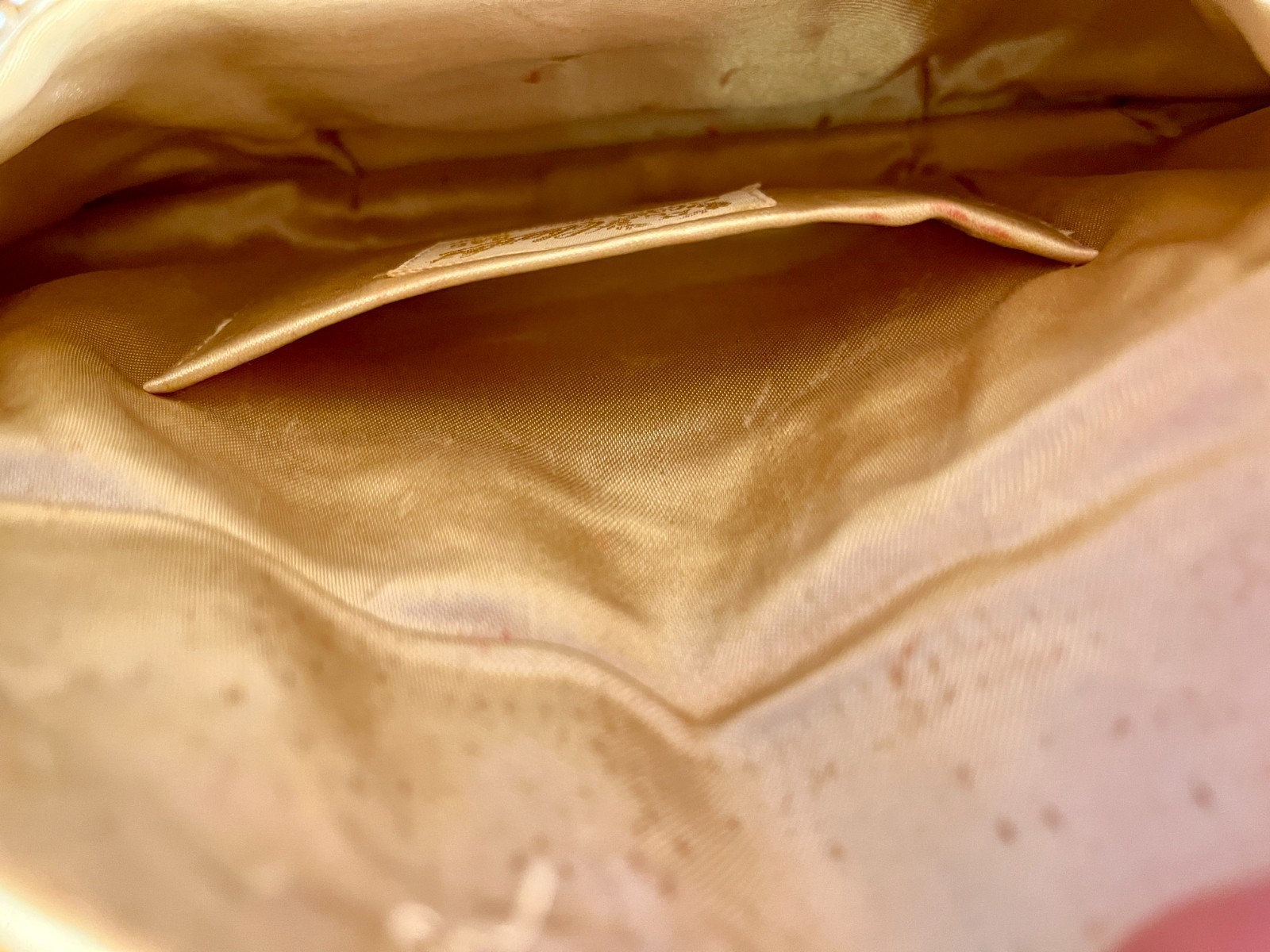 Satin interior lining has no stains or tears / foldover top shows some aging