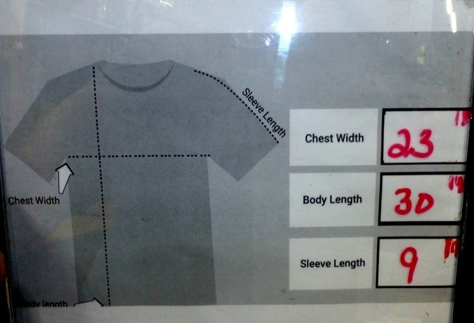 Chest Width = 23 inches, Body Length = 30 inches, Sleeve Length = 9 inches