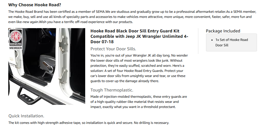 Hooke Road?s Wheel-Arch-built Door Sill Entry Guards are precision-engineered to protect the high-traffic threshold area of your Jeep Wrangler JK (2007?2018, Unlimited 4-door). Made from rugged, injection-molded polypropylene thermoplastic, the matte-black guards resist wear, impact, water and UV exposure while maintaining a factory-style finish.