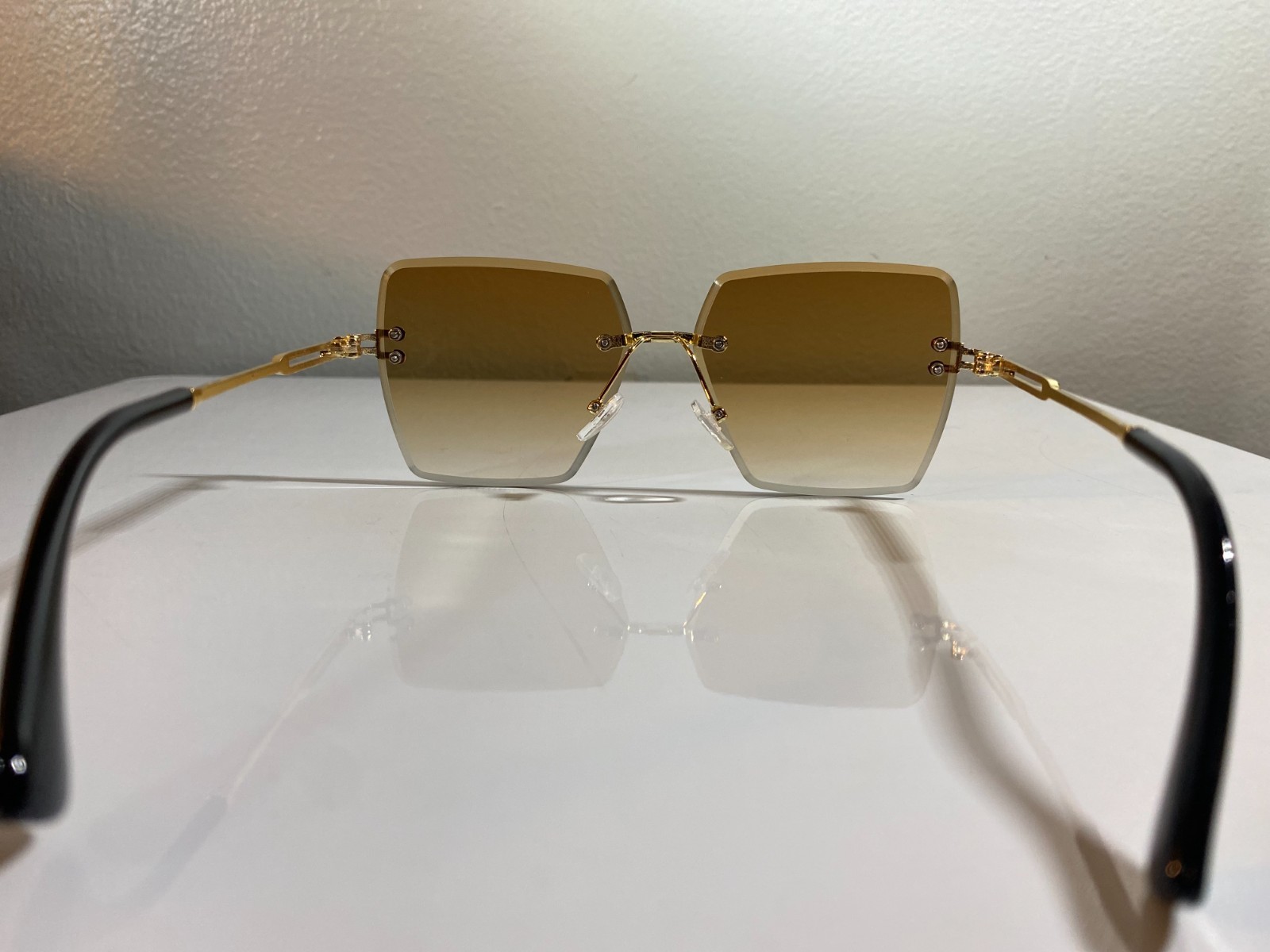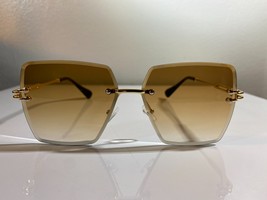 Unisex, rimless, oversized sunglasses with brown lenses and gold wire frame.