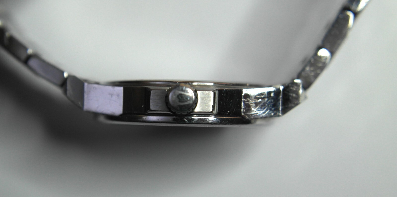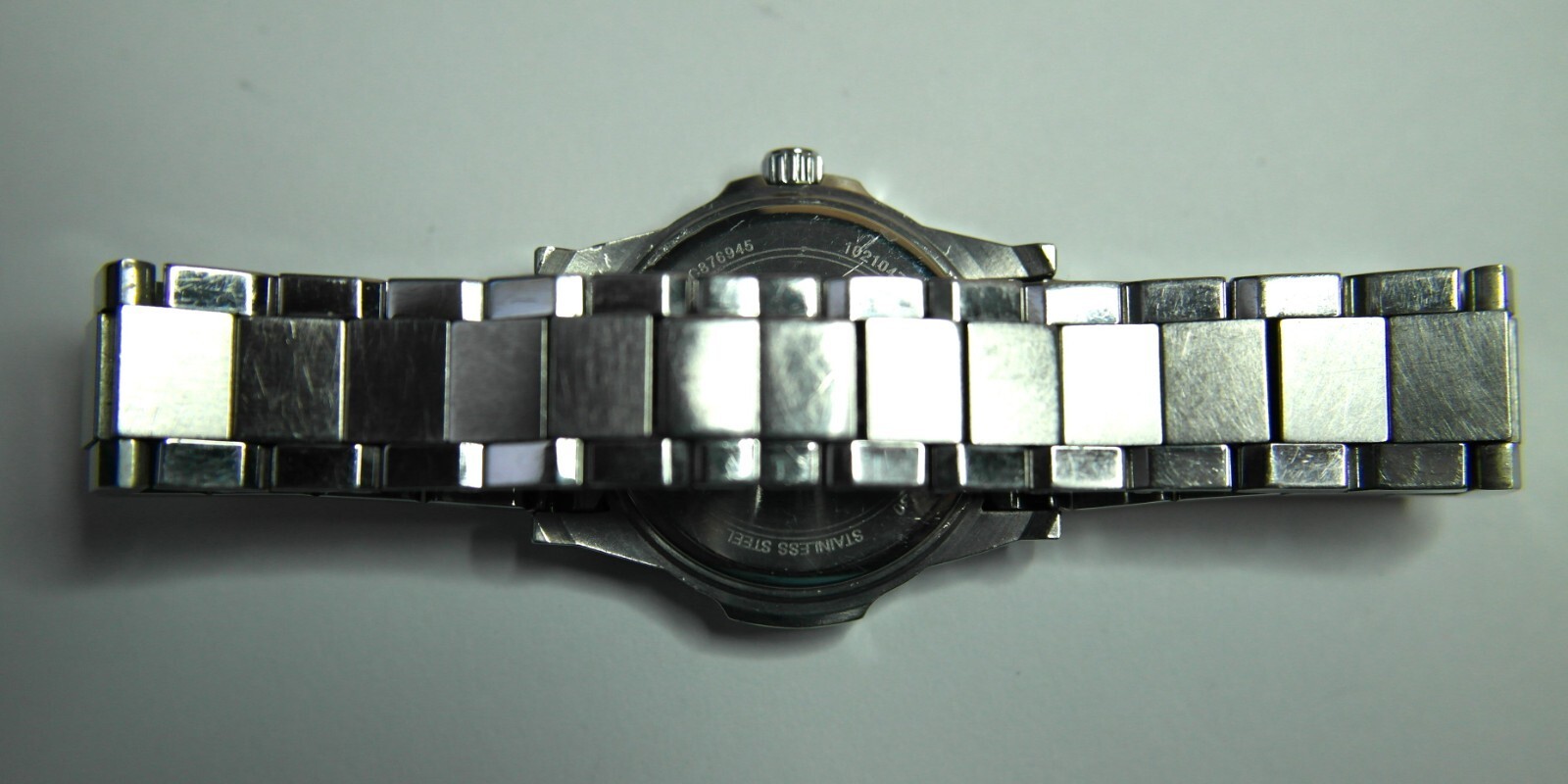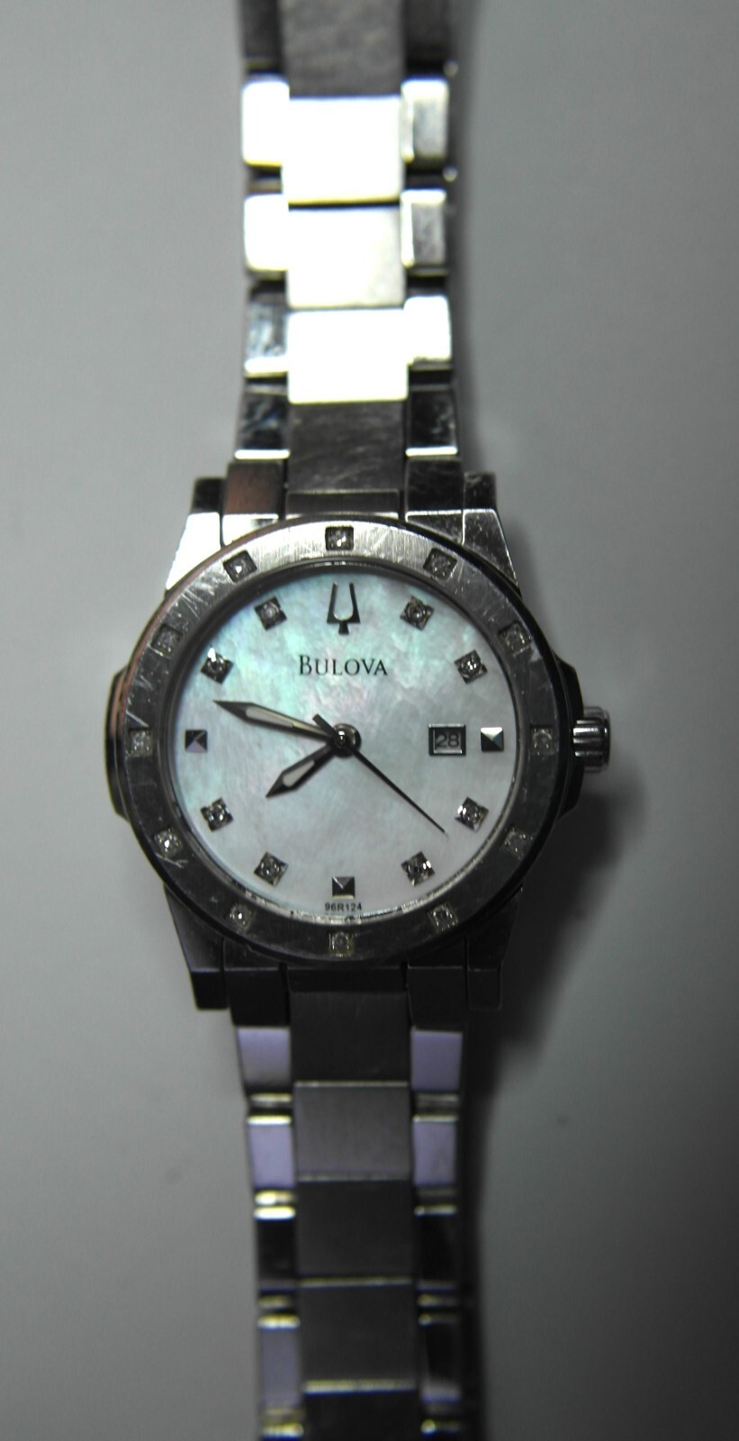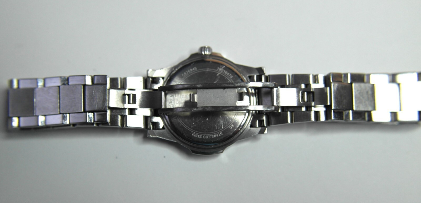 Very good running condition, is as shown in the photographs of the actual watch. It is all stainless steel with case diameter of 30 mm and has a MOP dial with silver toned hands and has 1 mm. diamond markers. It has Japan movement, Miyoto1L12, as shown in one of the photographs. The crystal is clean and has concealed butterfly clasp, and is good for wrist size of about 7 inches. The watch is pre-owned, and has been thoroughly cleaned with wipes and is ready for use, and comes from a pet and non-smoking environment.