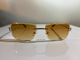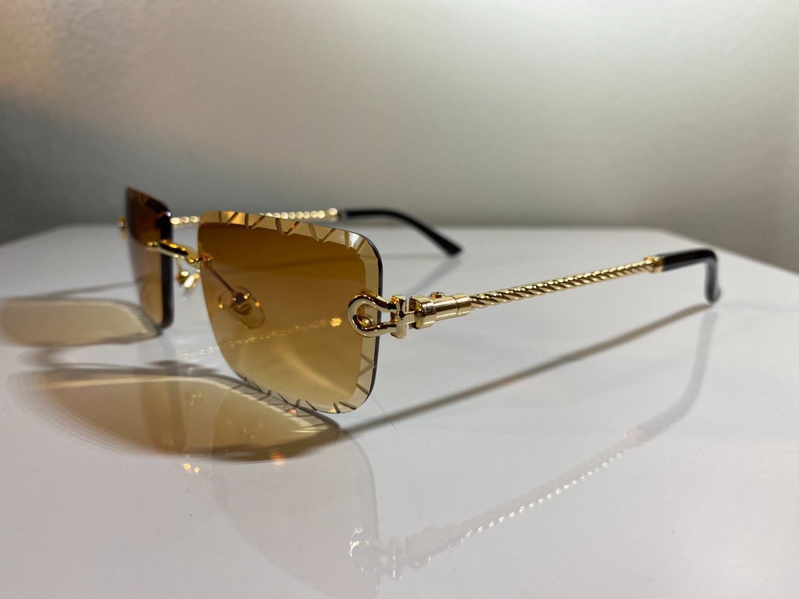 Unisex, rimless, gem cut sunglasses with brown lenses and gold wire frame.