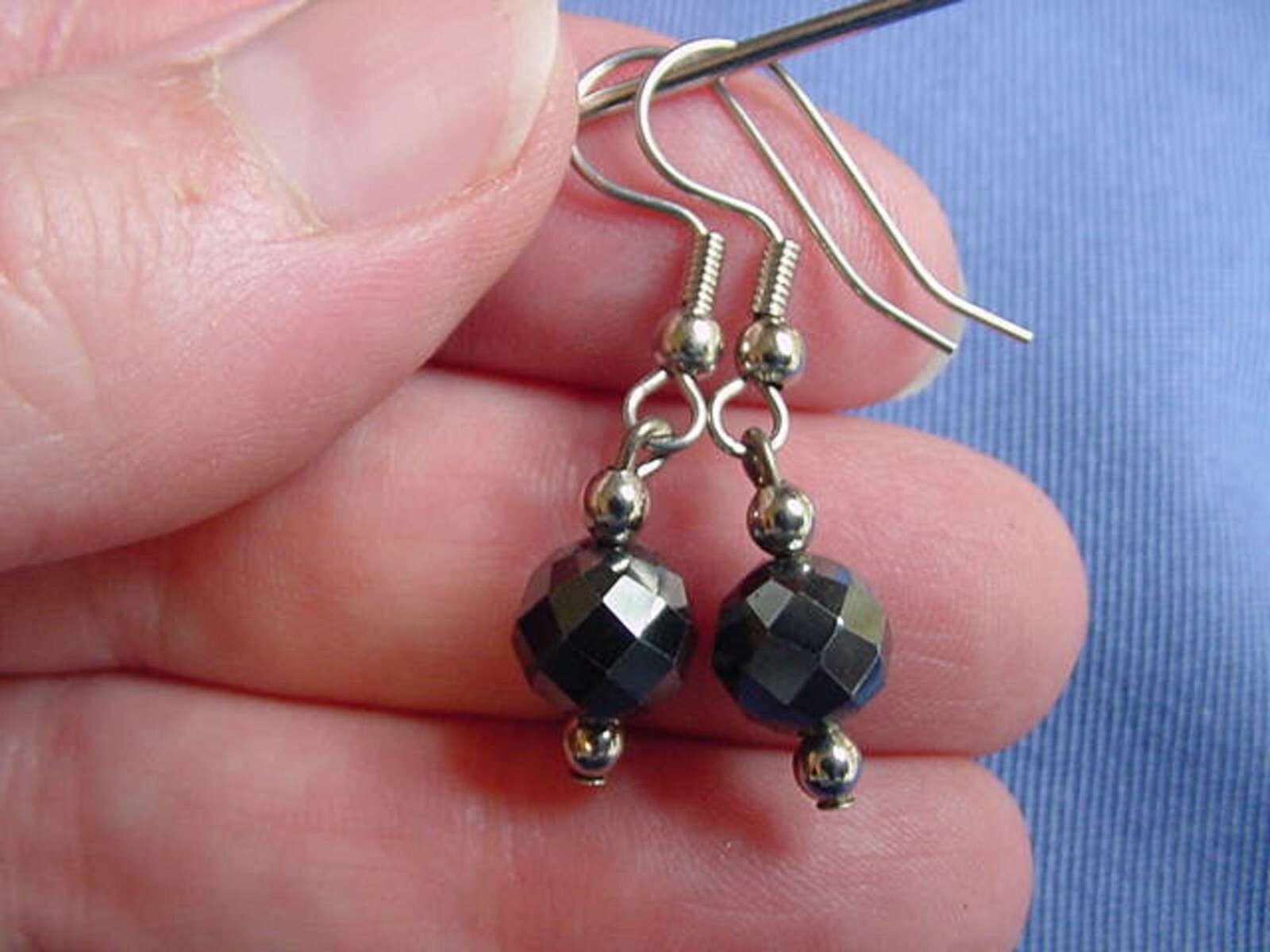 HEMATITE BEAD EARRINGS- Hematite (called Black Diamond in Alaska where it is mined) is iron oxide, a high quality gem with a highly polished gun metal sheen. French wire dangle earrings, hypoallergenic gold color or silver color, made by Glenn.
