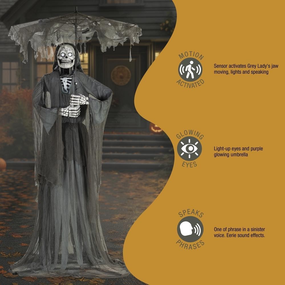 Her eyes light up and her jaw drops on the last phrase, adding an eerie and bone-chilling touch to your Halloween decor.