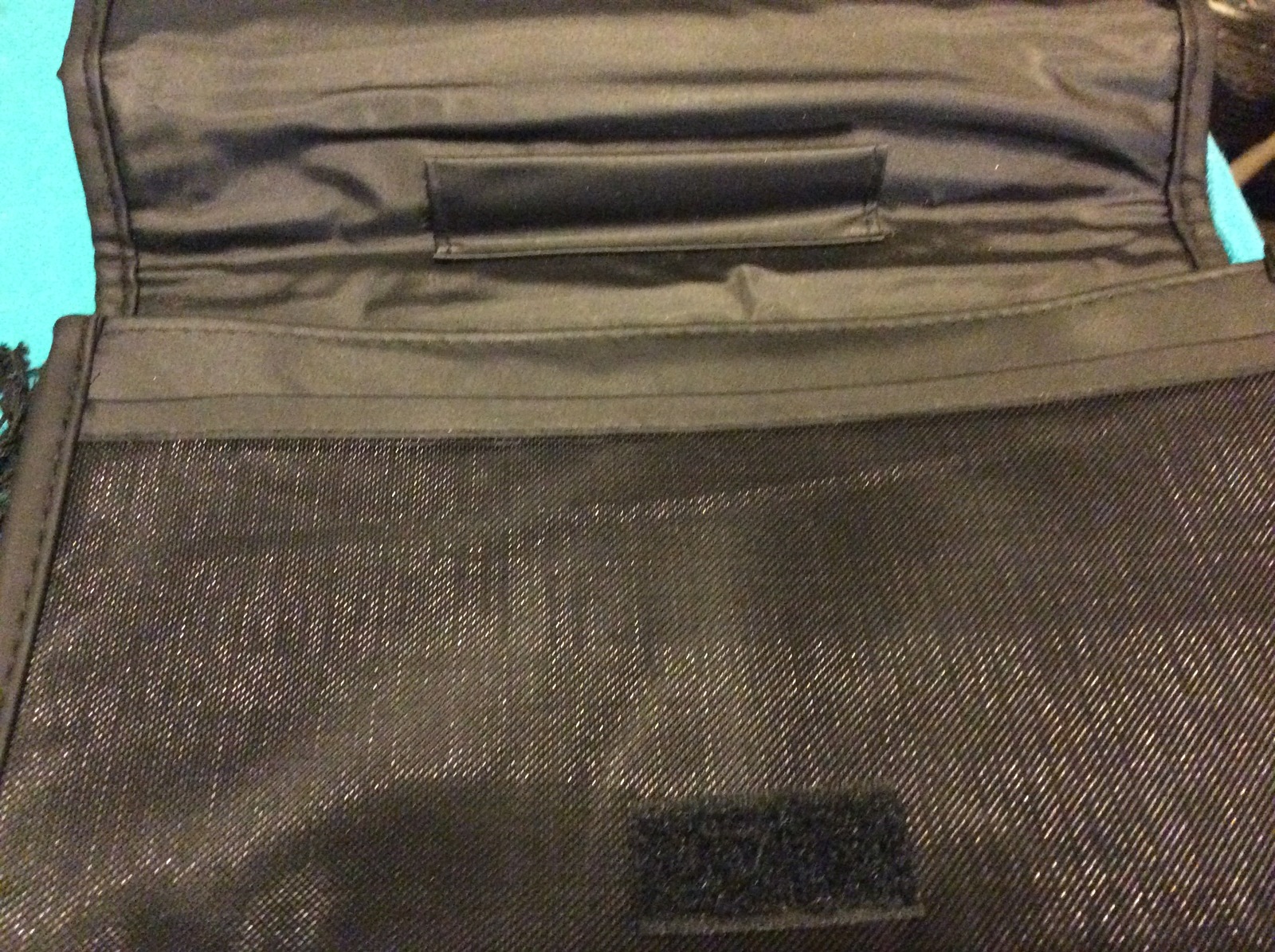 TWO CLUTCHES - BOTH UNKNOWN BRANDS - ONE IS BLACK with GOLD STRIPES and is very soft is a zipper close - ONE IS SOLID BLACK with a velcro close