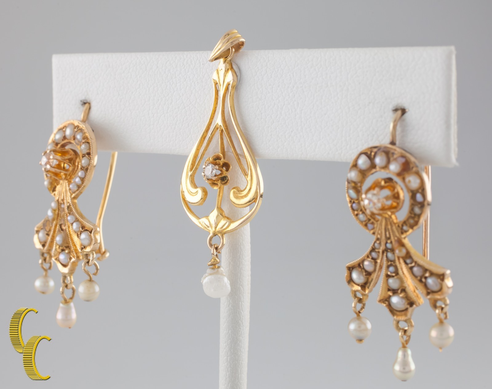An Amazing set Of Pendant And Earrings Made From 14k Yellow Gold, seed pearls, and diamonds