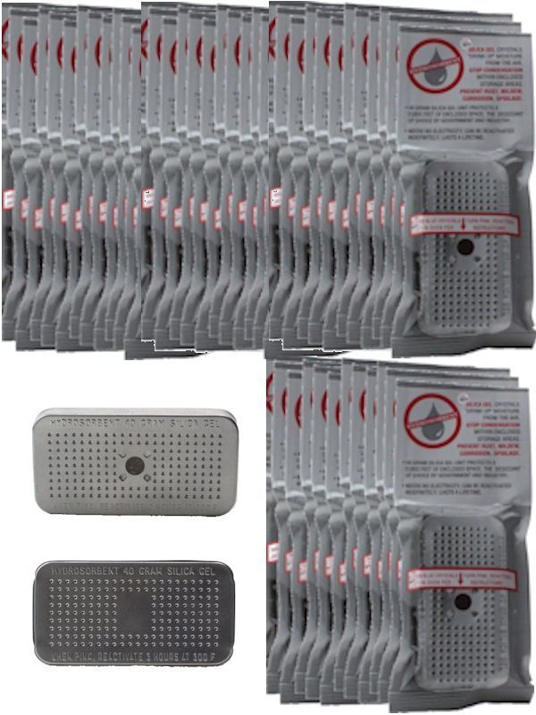 40 Gram Silica Gel Desiccant (48 pack), top grade silica gel is contained within a compact aluminum canister. Provides lifetime protection and has a built-in indicator that turns from blue to pink to signal the need for reactivation. Easy to reactivate in any oven. Place the unit in a vented 300 degree F oven for at least 3 hours (or until the silica gel turns blue again). The more tightly you can make the storage area being protected, the better your silica gel will work. Silica gel beads are inert and non-toxic. The will Not emit harmful vapors, stain or cause any chemical reaction. Safe to use with foods, medicines, sensitive materials. Dehumidify any space to protect your coins, jewelry, electronics, films, RV's, safes, and so much more. Size: 4 x 2 x 1/2" , Protection: 3 cubic feet of enclosed space.