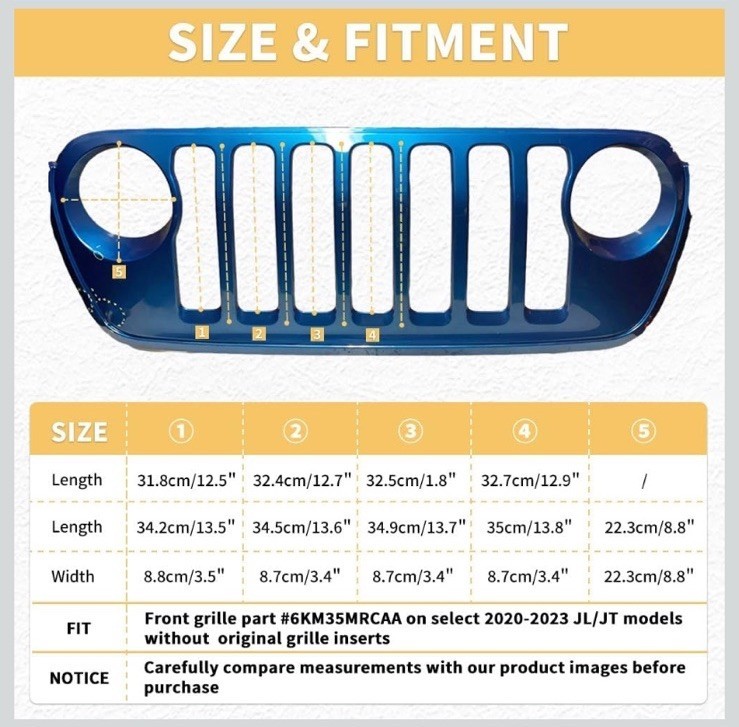 The 9Pcs Front Grille Inserts Cover Trim for Jeep Wrangler JL Sport 2018-2024 by Maxdom is a set of black ABS plastic inserts designed to fit the original grille without decoration rings on 2018+ Jeep Wrangler JL models. The manufacturer offers a 1-year warranty for the product, ensuring high quality and durability. These front grille inserts add a stylish touch to the vehicle, enhancing its exterior appearance with a sleek and polished finish.