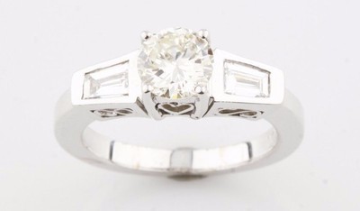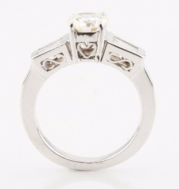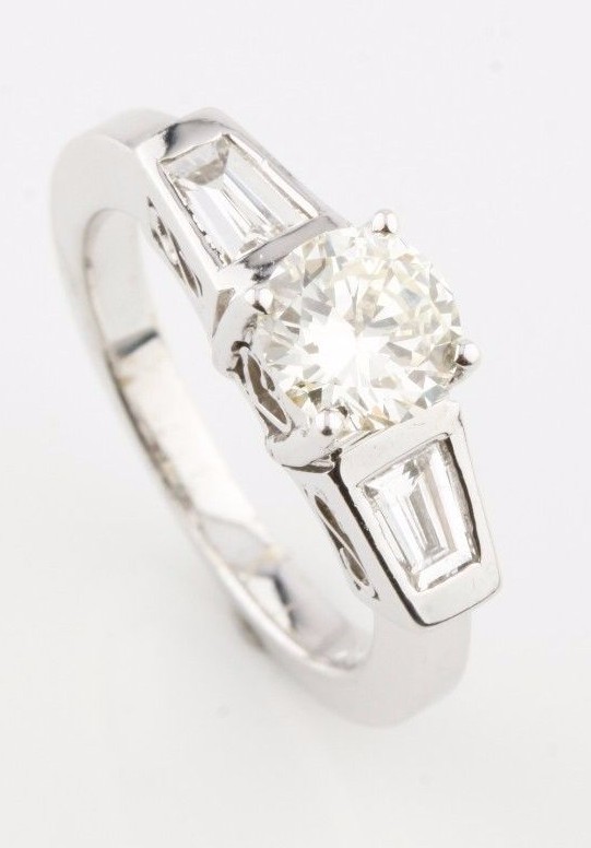 Features Round Brilliant Prong-Set Center Stone w/ two Bezel-Set Tapered Baguette accent stones set on a delicate filigree gallery