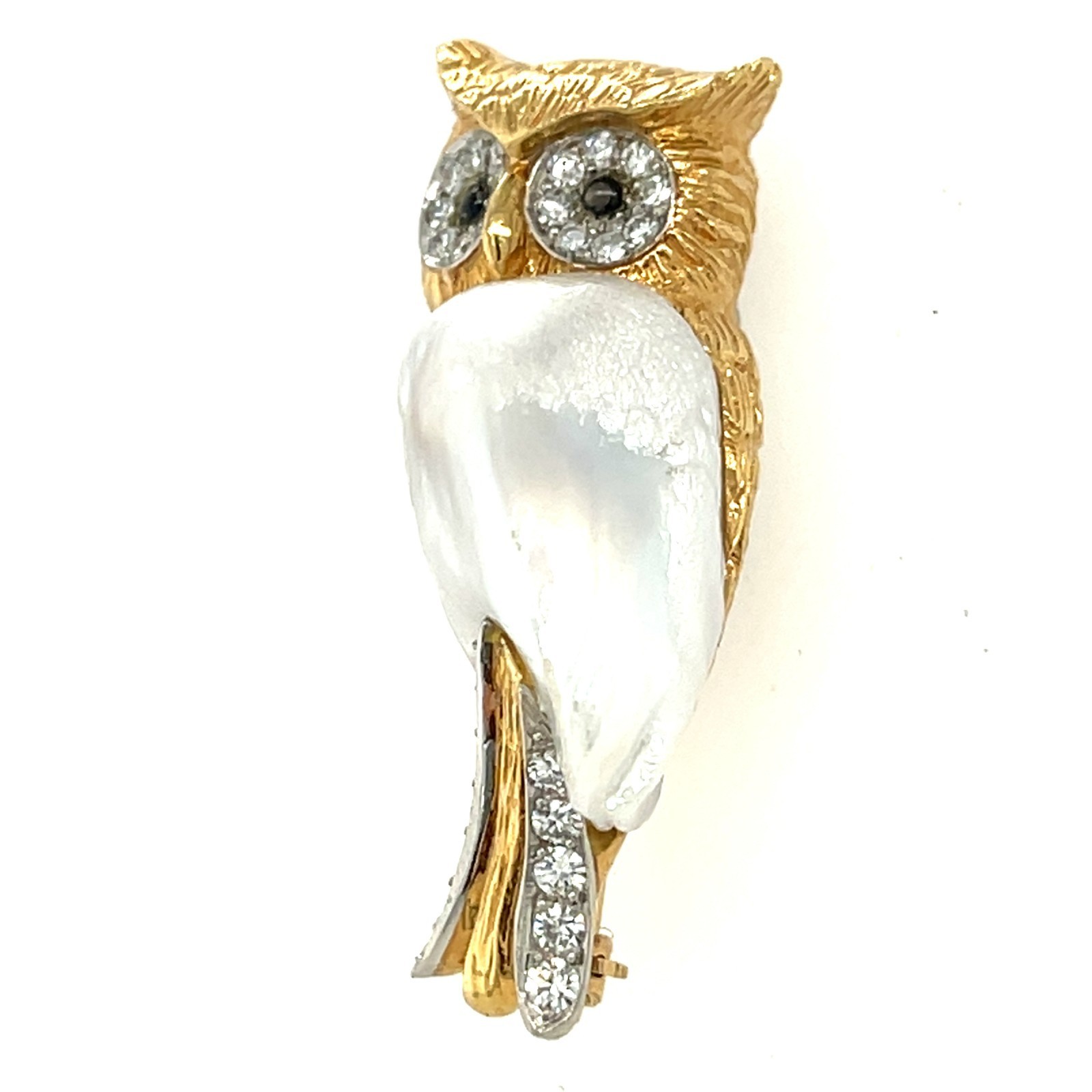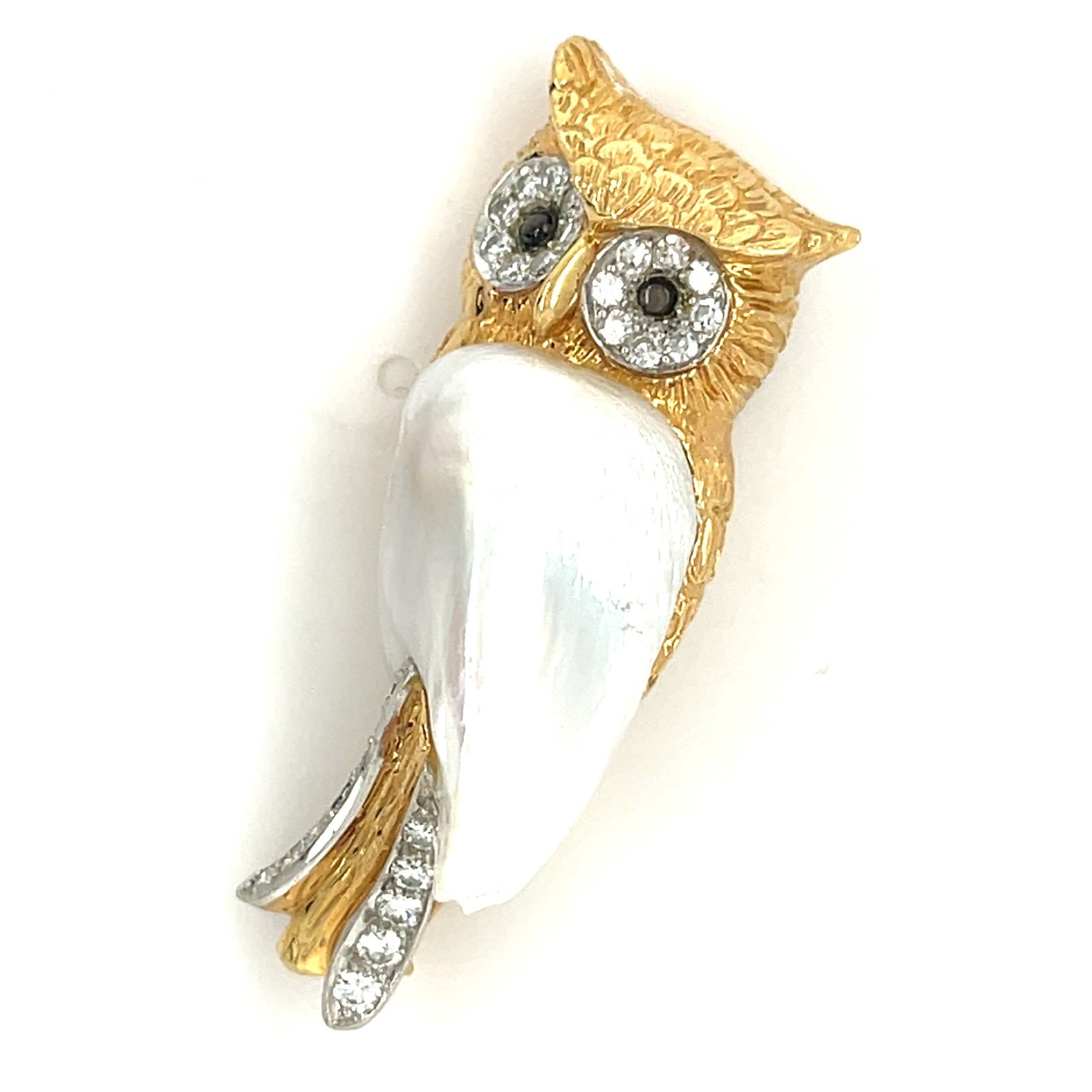 Ruser 18k Gelbgold Süßwasser Gezüchtete Perle Eule Brosche 0.60 Karat Diamant