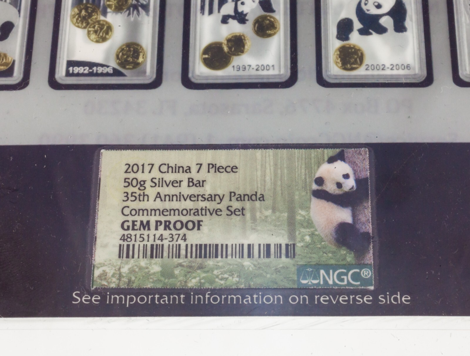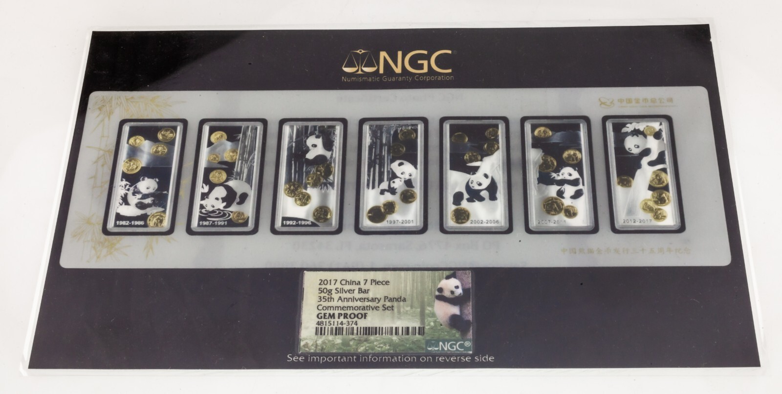 2017 Chine 7 Piece 50 Gram Argent Barre 35th Anniversaire Panda Kit NGC Gem Anti