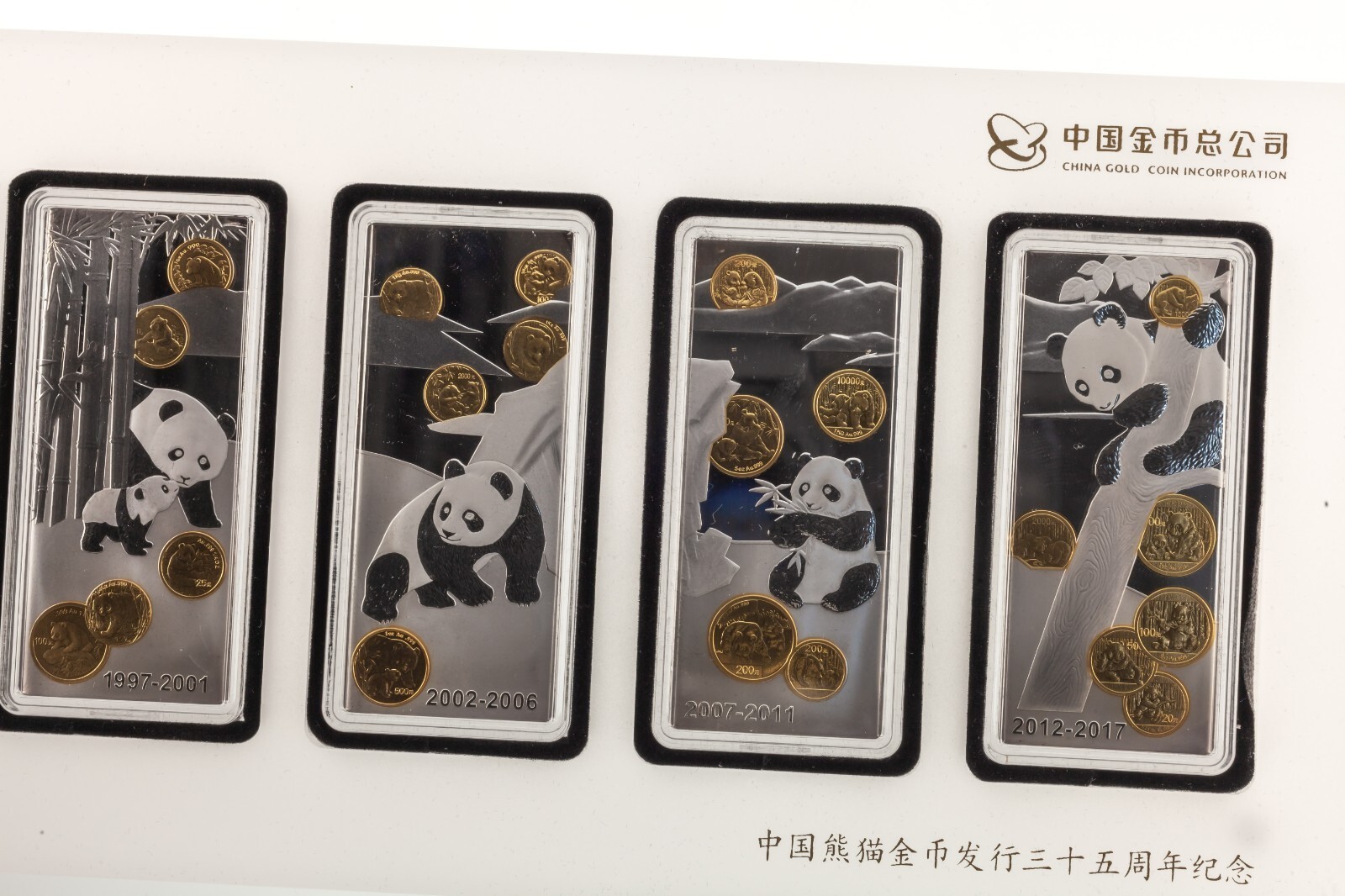 Les lingots d'argent commemoratifs pour le 35e anniversaire de l'emission de la piece d'or Panda chinois sont emis par la China Gold Coin Incorporation, frappes par Shenyang Mint Co., Ltd. et distribues uniquement par Shanghai Gold Coin Investment Co., Ltd. L'avers represente les pandas gambadant dans les forets de bambous, decores de motifs des pieces d'or chinoises Panda (le placage en or selectif), et marque les versions de l'annee correspondantes sur la partie inferieure. Le revers represente le logo de la China Gold Coin Incorporation et les mots « 35e anniversaire de l'emission de la piece d'or du panda chinois » en chinois, ainsi que le titre et le poids. Les 7 barres peuvent reconstituer un motif complet. Il s'agit de certifier que les barres sont standards quant a leur finesse et leur poids.