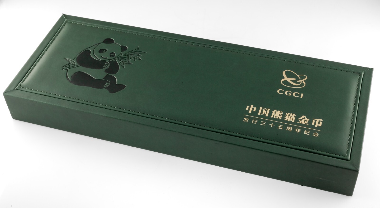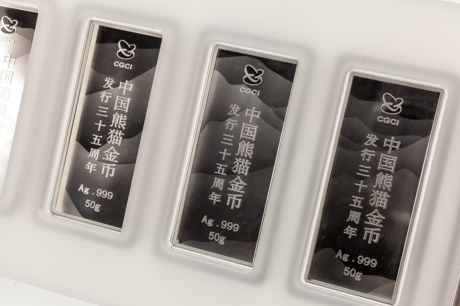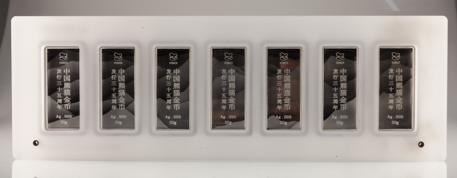 Les lingots d'argent commemoratifs pour le 35e anniversaire de l'emission de la piece d'or Panda chinois sont emis par la China Gold Coin Incorporation, frappes par Shenyang Mint Co., Ltd. et distribues uniquement par Shanghai Gold Coin Investment Co., Ltd. L'avers represente les pandas gambadant dans les forets de bambous, decores de motifs des pieces d'or chinoises Panda (le placage en or selectif), et marque les versions de l'annee correspondantes sur la partie inferieure. Le revers represente le logo de la China Gold Coin Incorporation et les mots « 35e anniversaire de l'emission de la piece d'or du panda chinois » en chinois, ainsi que le titre et le poids. Les 7 barres peuvent reconstituer un motif complet. Il s'agit de certifier que les barres sont standards quant a leur finesse et
