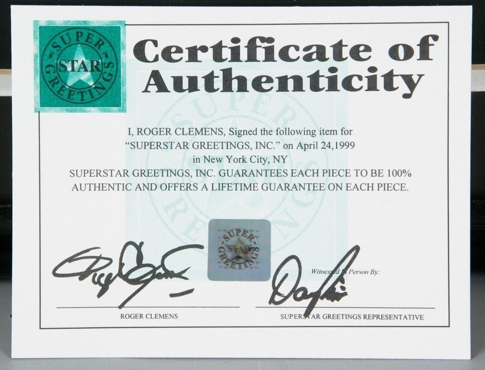 "I, ROGER CLEMENS, Signed the following item for "SUPERSTAR GREETINGS, INC." on April 24, 1999 in New York City, NY SUPERSTAR GREETINGS, INC. GUARANTEES EACH PIECE TO BE 100% AUTHENTIC AND OFFERS A LIFETIME GUARANTEE ON EACH PIECE."