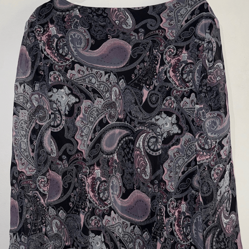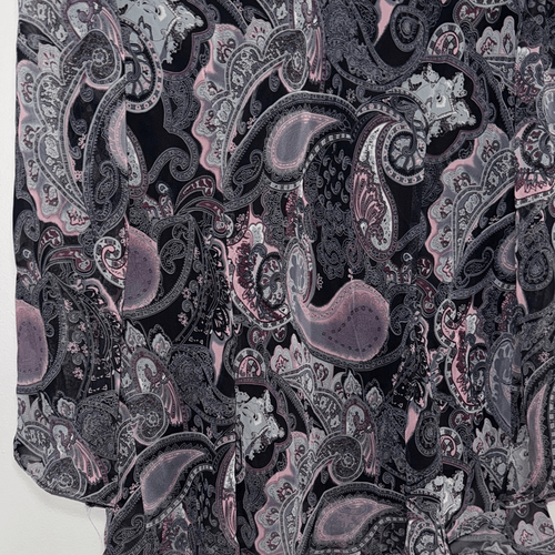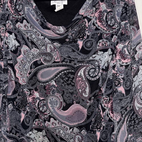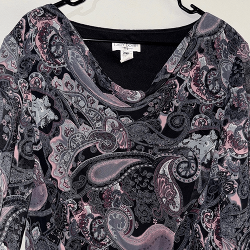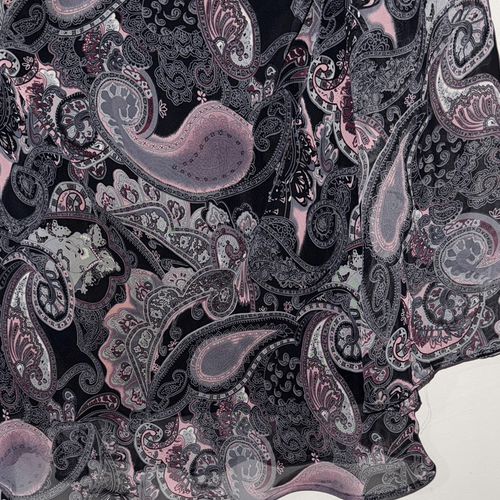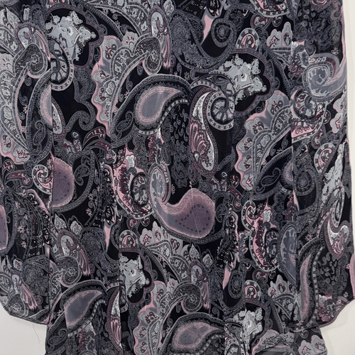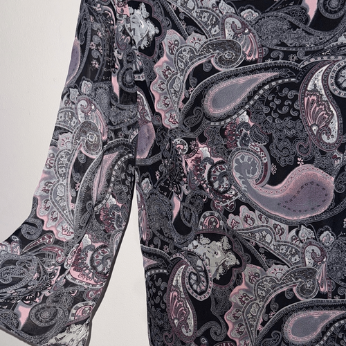 Stylish paisley blouse featuring a blend of black, gray, and pink. Perfect for a fashionable and comfortable look.