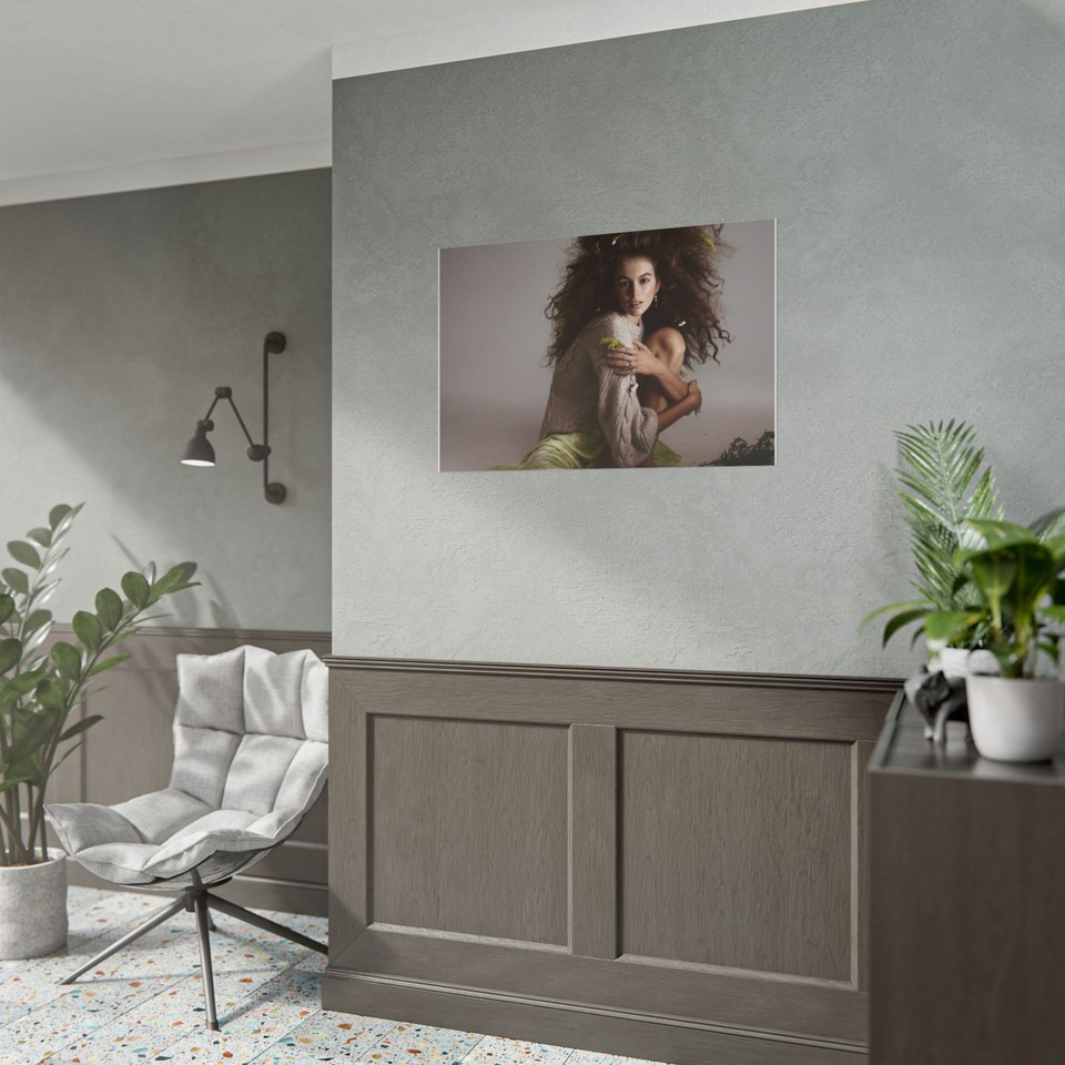 A beautiful shot of the model Kaia Gerber with big hair, perfect to hang on a bedroom wall. This rolled poster gives off a trendy and fashionable vibe, ideal for young adults looking to decorate their living spaces with a stylish touch. Great for birthdays, fashion enthusiasts, and home decor lovers.