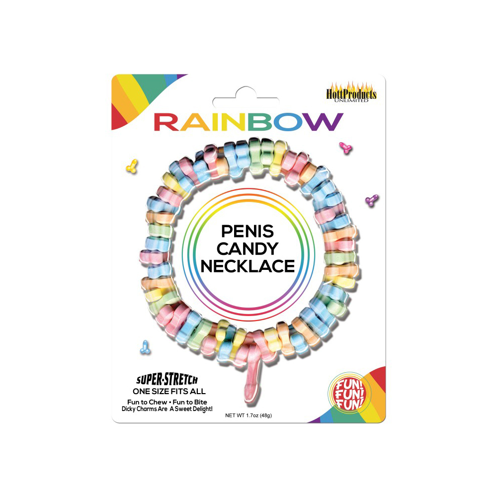 Penis shaped multi flavored candy charms in a super stretchy necklace! Bite one off for a sweet treat, or have fun with your intimate partner as they nibble away at your neck! Great party favor or gag gift!