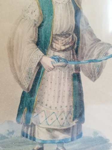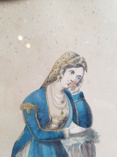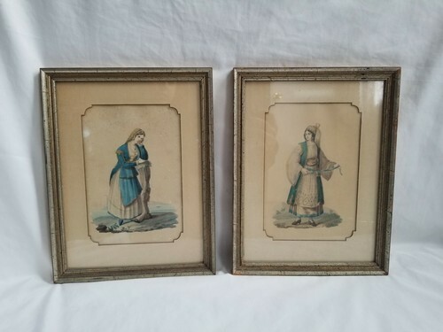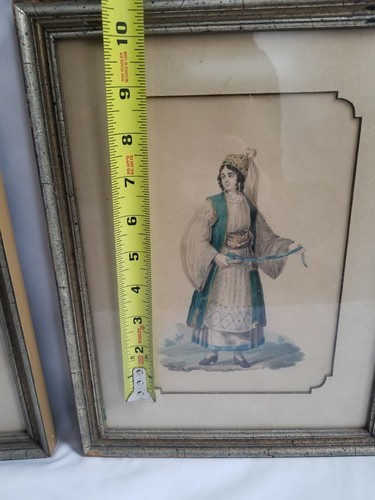 This is a antique watercolor paintings showing two women wear traditional dresses. We believe they are kost likely of Balkan/Bosnian/Serbian descent. They not signed. Paper shows age related yellowing. Also one of the paintings has some spotting on the top corner. Oroginal frames they came in with from the estate sale. Approximately made between 1860-1910.