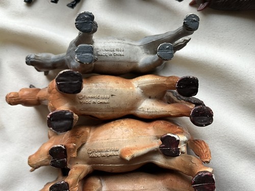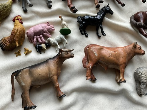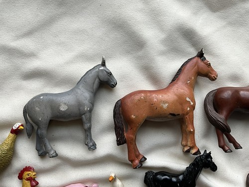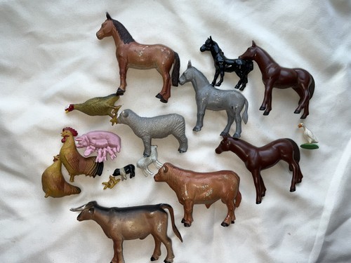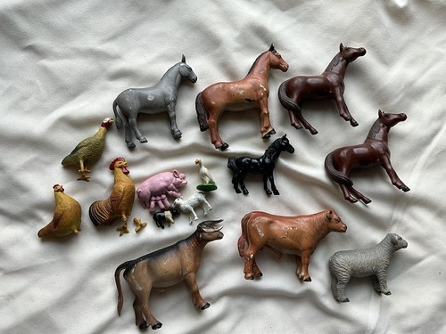 This is a lot of 14 different vintage farm animals and horses. There are some marked Funrise 1989 and two horses marked ERTL. They are all in good used played with vintage condition and the two chickens have unfortunately had their little feet broke off. The feet are there for one of them, but not for both. These are great items for play or adding to a display or decor.
