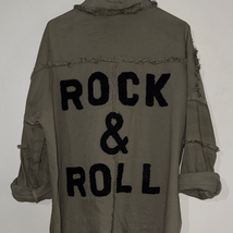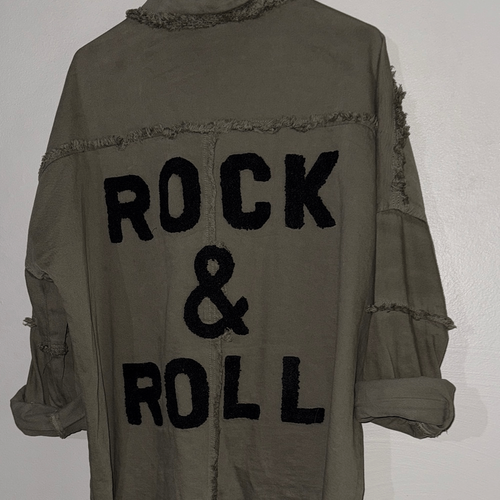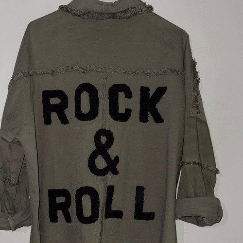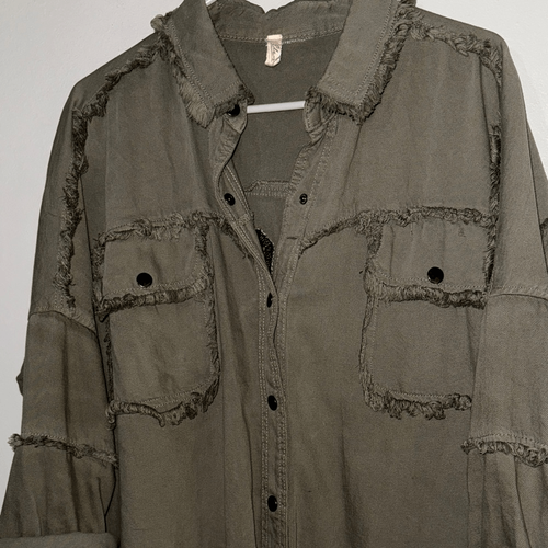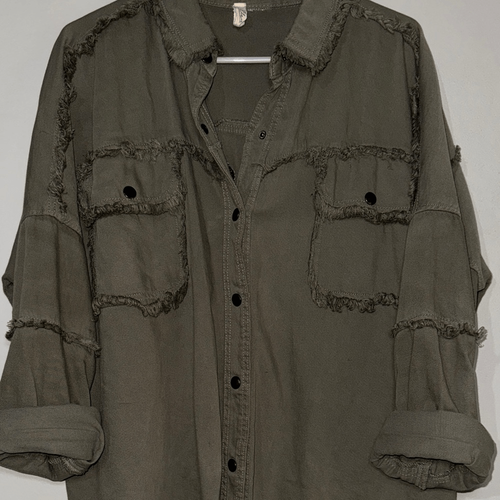 Stylish dark olive shirt jacket by Elan. Features button-up front and frayed edges. Ideal for casual wear.