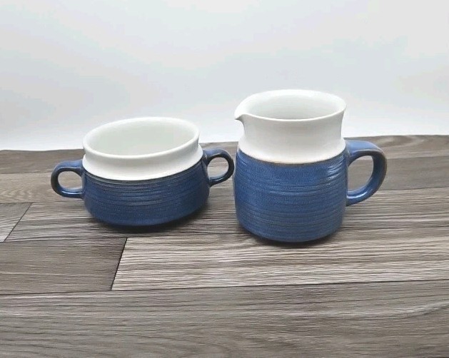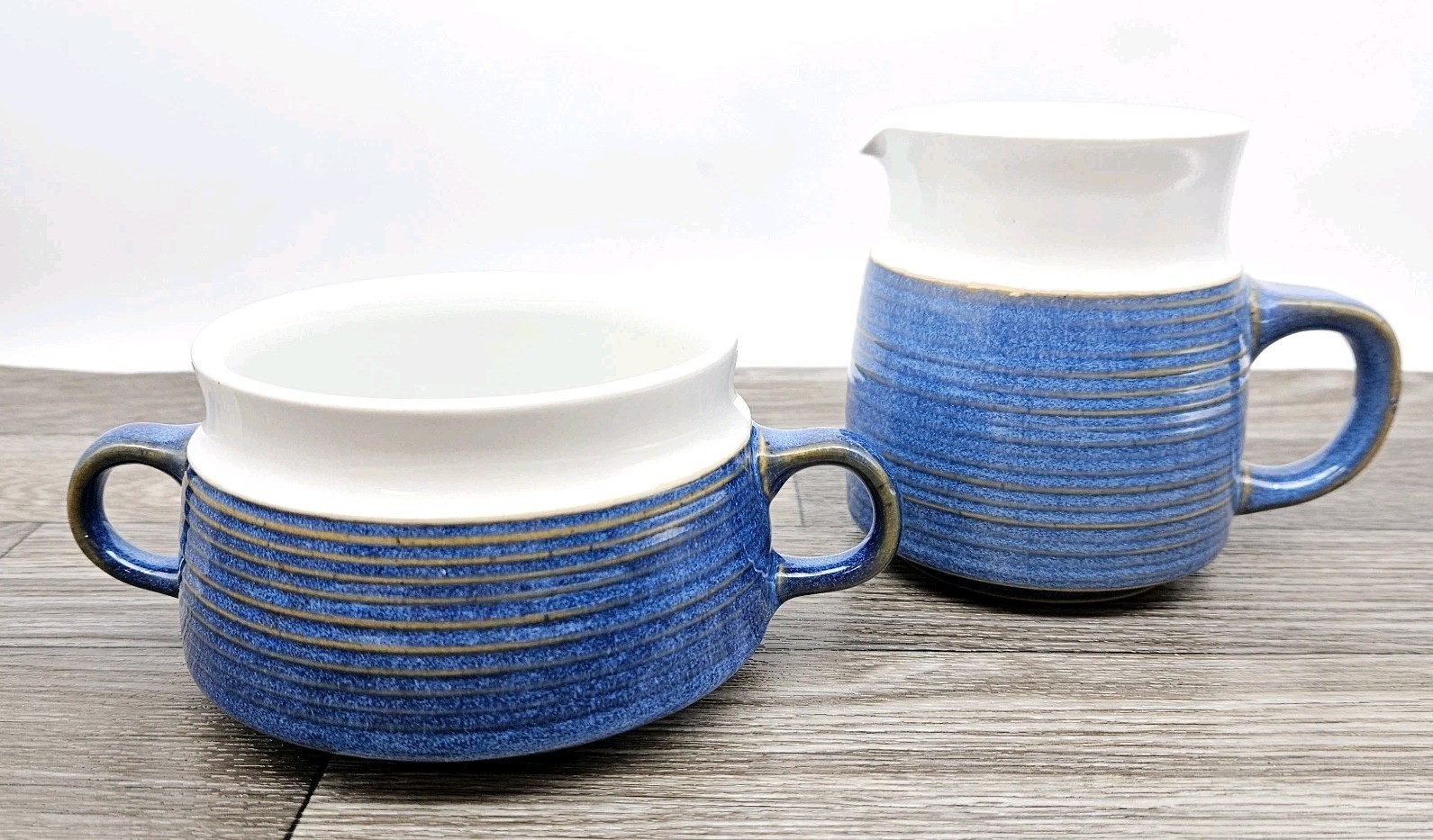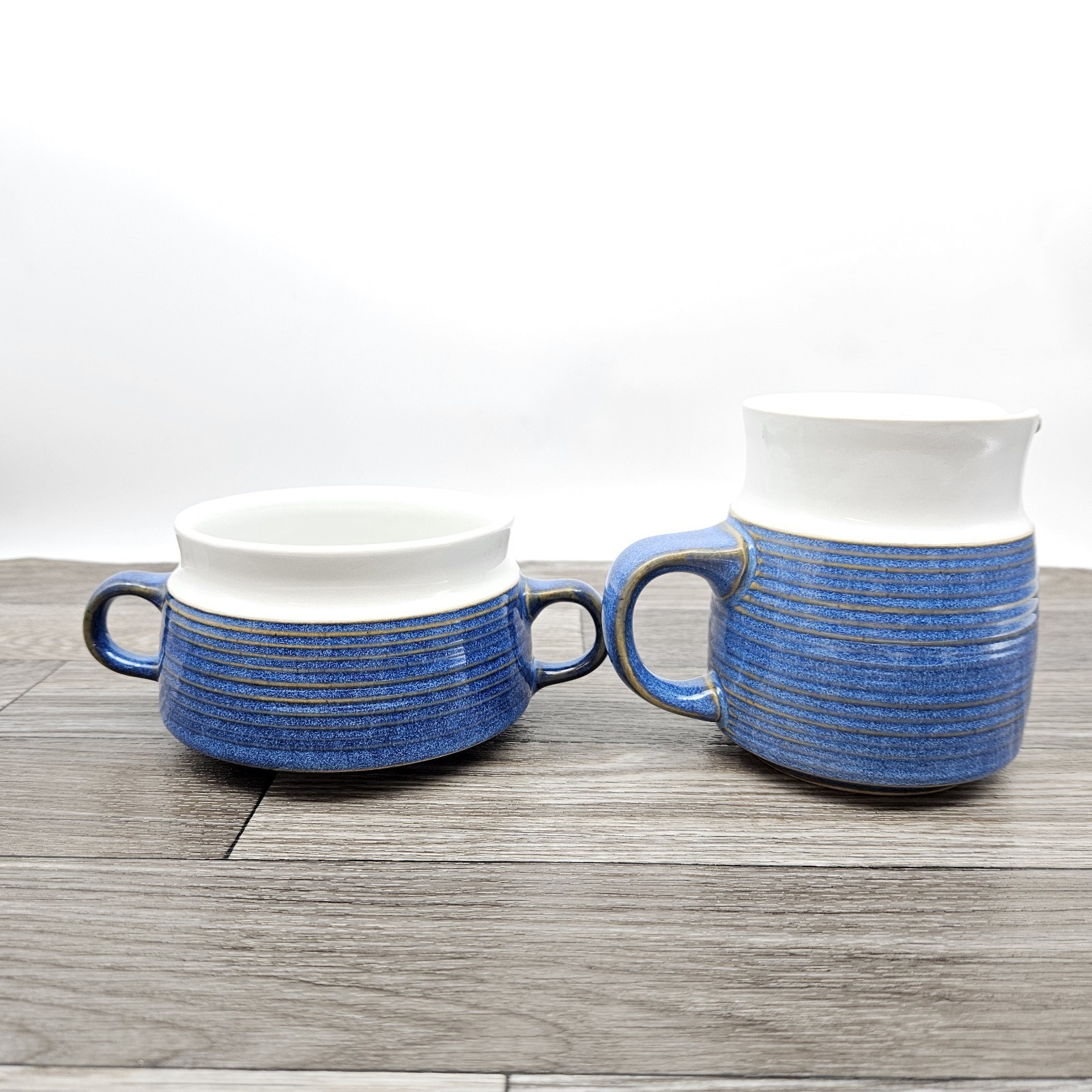 Denby Chatsworth Open Sugar Bowl and Creamer Set Blue White Vintage England