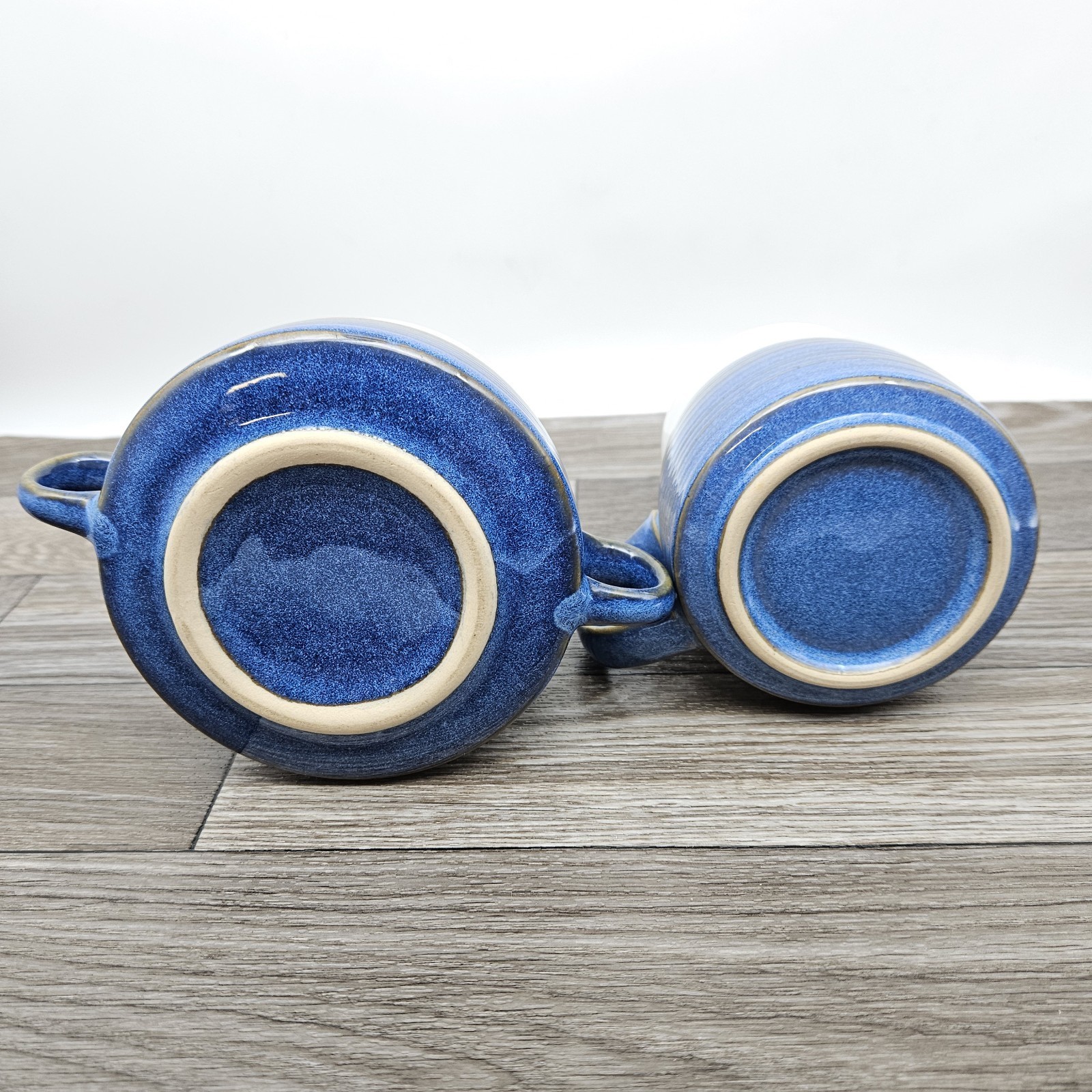 Made in England, this mid-century modernism style set includes a small round creamer and sugar bowl, each with a blue and white pattern and a glossy finish. The stoneware material ensures durability