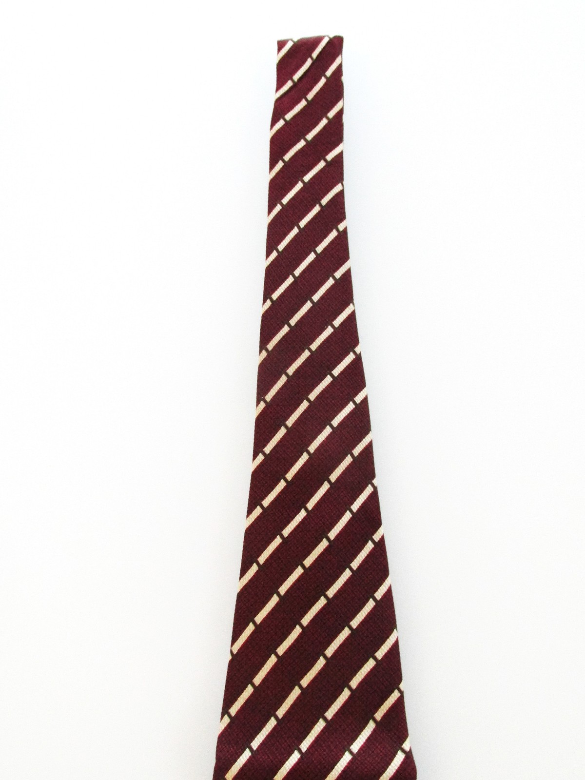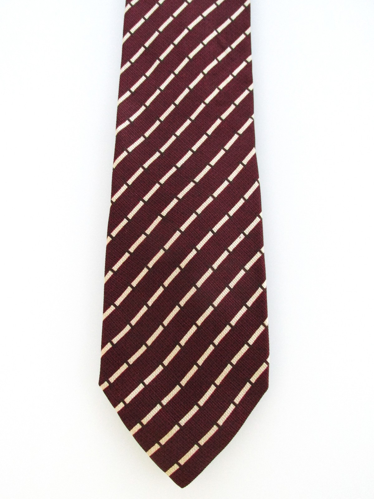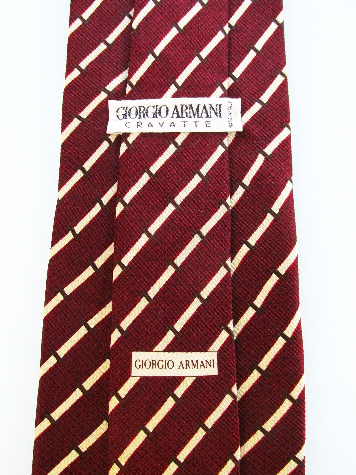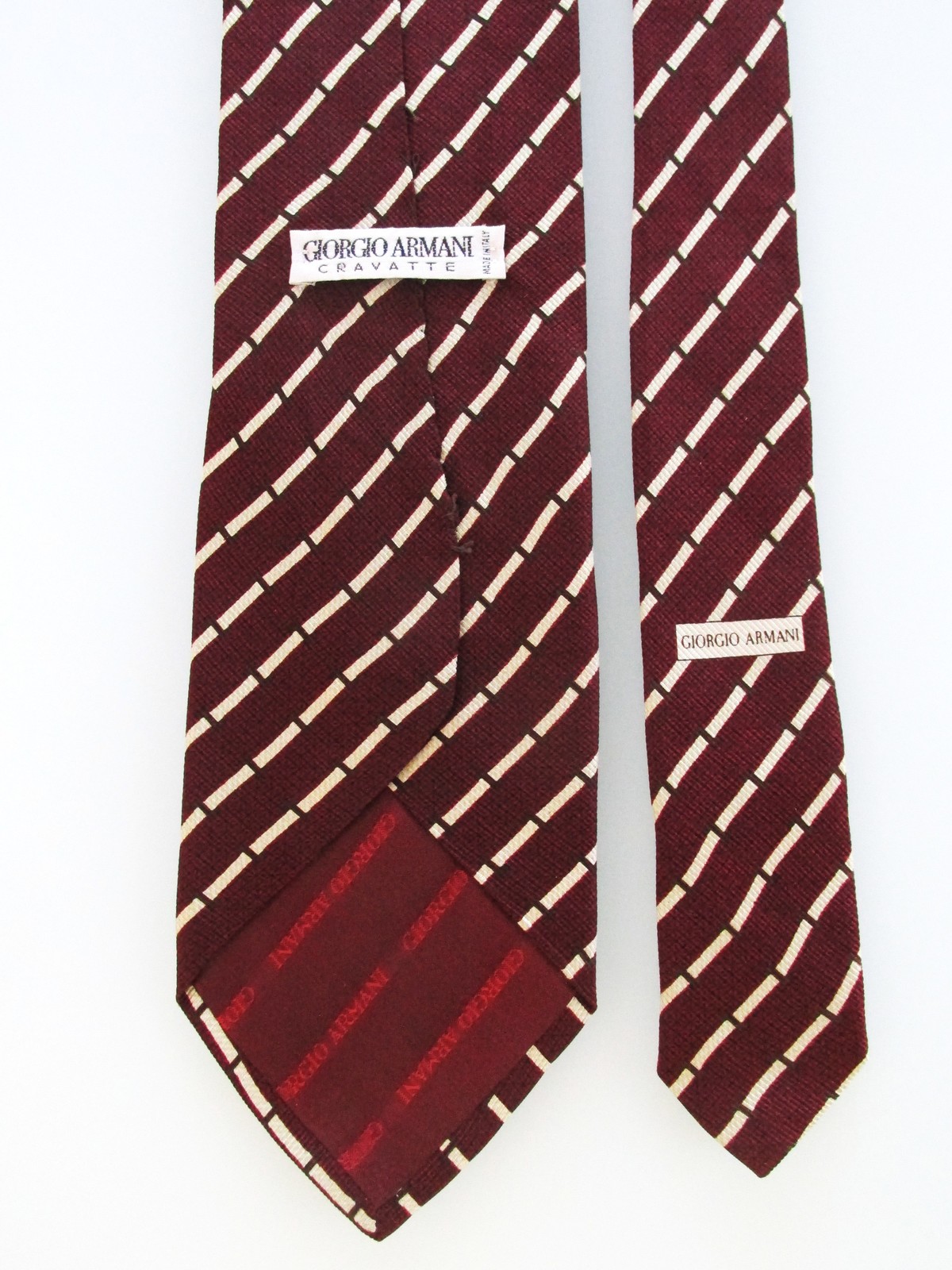 Description: Up for sale is a designer men's silk tie by Armani. The tie is made in Italy of 100% silk. The tie has a off white and black striped pattern on a very dark red background. The dimensions are approximately 56" long x 3.75" wide. This tie is in excellent condition.