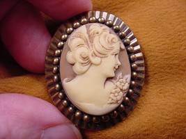 (Internal #CS27-13) Excellent, new, hand stained natural pine resin, hand-molded (-duced from the original shell cameo) cameo brooch in OFF-WHITE colored pine resin with MAUVE PINK colored background is mounted on - - brass, cameo itself is 1" long x 3/4" wide. Clasp pin/pendant glued on back. Excellent detail. Hairstyle is an up-do in curls with a hair comb, flowers on her shoulder. Very pretty. I do half the work in creating the cameos, along with a couple who are professional mold-makers. Comes with information card.
