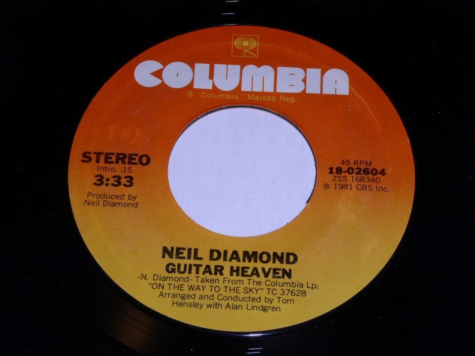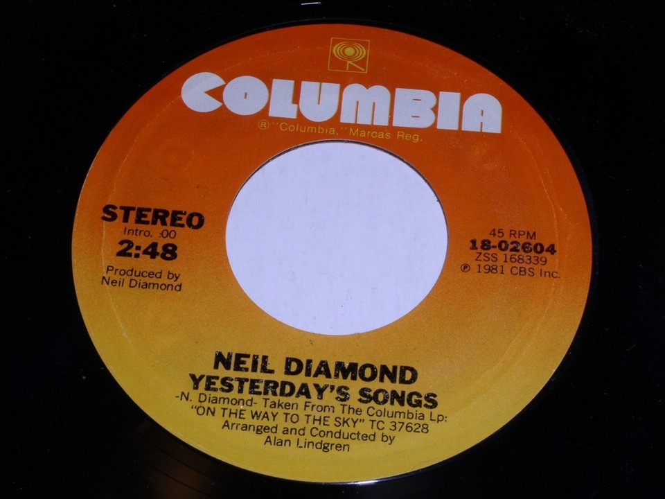 This is a vintage 45 rpm phonograph record by Neil Diamond entitled, "Yesterday's Songs". Flipside: "Guitar Heaven". Record label Columbia 18-02604. Comes with its original picture sleeve as shown.