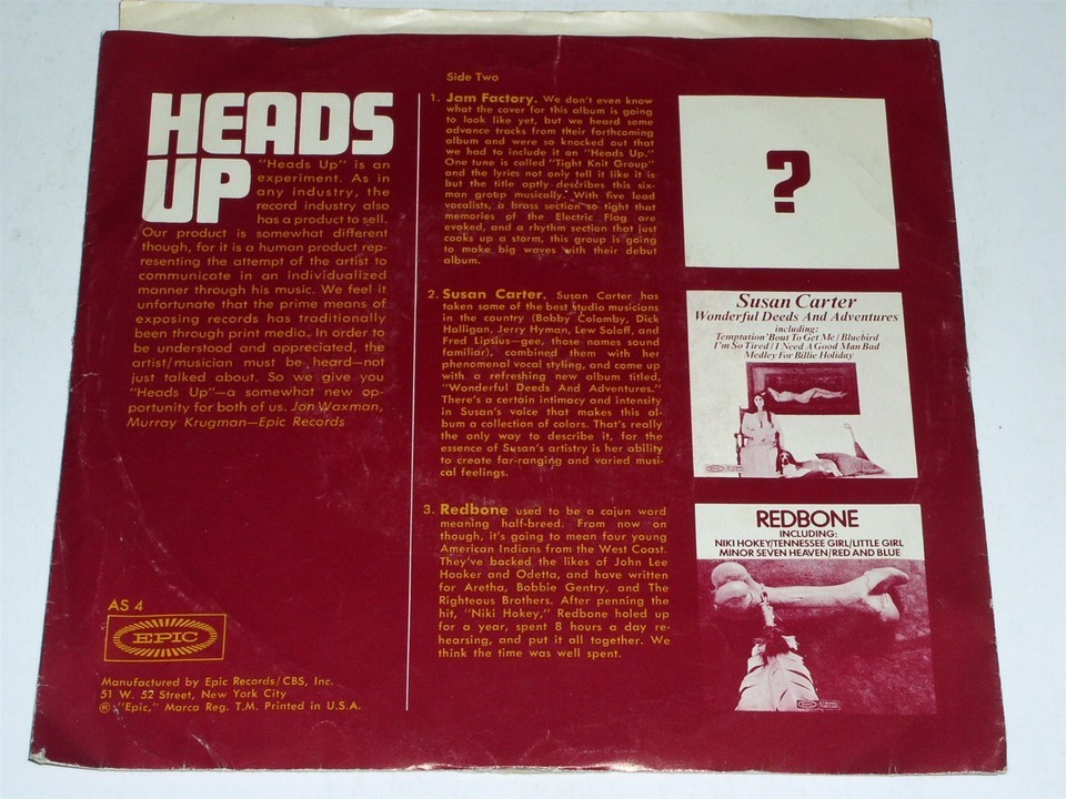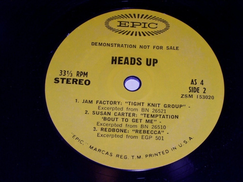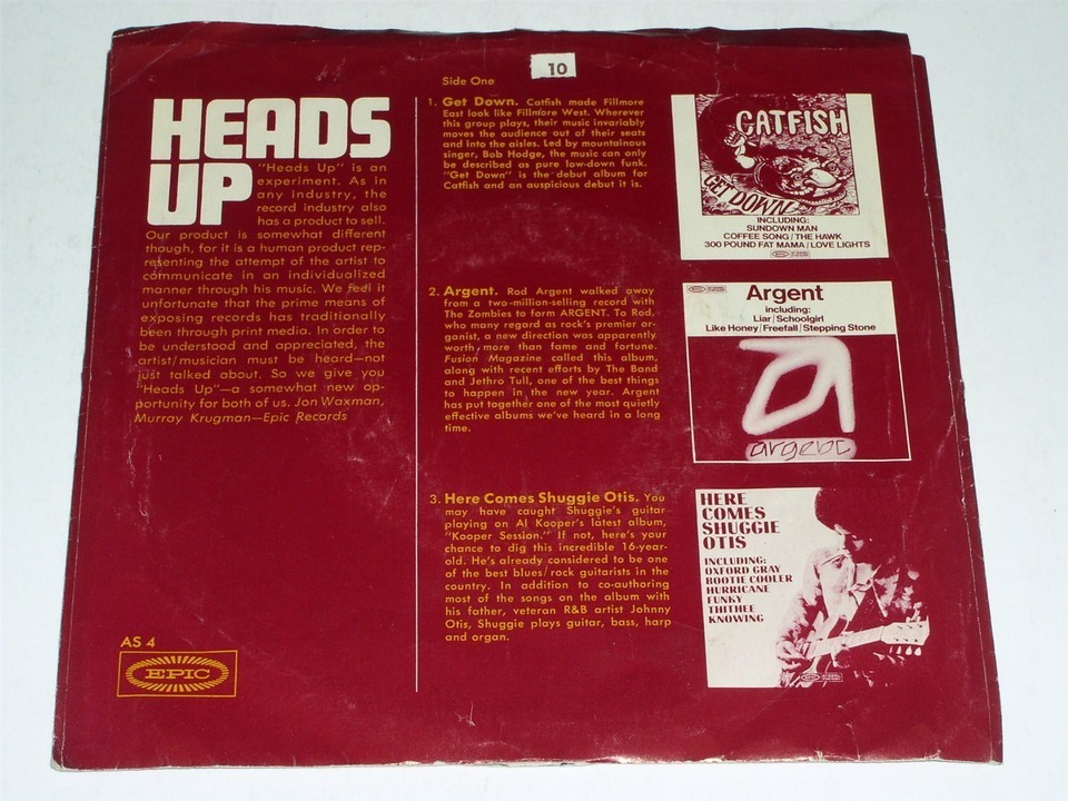 This is a vintage promotional 33 1/3 rpm phonograph record entitled, "Heads Up". Songs by artist's, Catfish, Argent, Shuggie Otis, Jam Factory, Susan Carter, Redbone. Record label: Epic AS 4.