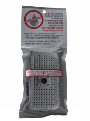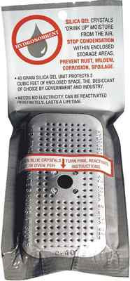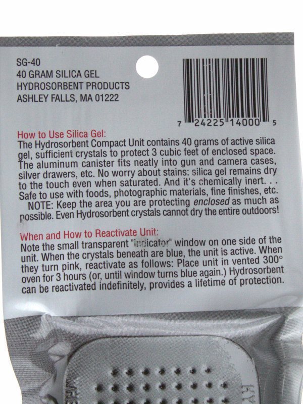 40 Gram Silica Gel Desiccant (4 pack), top grade silica gel is contained within a compact aluminum canister. Provides lifetime protection and has a built-in indicator that turns from blue to pink to signal the need for reactivation. Easy to reactivate in any oven. Place the unit in a vented 300 degree F oven for at least 3 hours (or until the silica gel turns blue again). The more tightly you can make the storage area being protected, the better your silica gel will work. Silica gel beads are inert and non-toxic. The will Not emit harmful vapors, stain or cause any chemical reaction. Safe to use with foods, medicines, sensitive materials. Dehumidify any space to protect your coins, jewelry, electronics, films, RV's, safes, and so much more. Size: 4 x 2 x 1/2" , Protection: 3 cubic feet of enclosed space.
