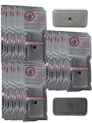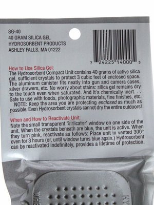 40 Gram Silica Gel Desiccant (36 pack), top grade silica gel is contained within a compact aluminum canister. Provides lifetime protection and has a built-in indicator that turns from blue to pink to signal the need for reactivation. Easy to reactivate in any oven. Place the unit in a vented 300 degree F oven for at least 3 hours (or until the silica gel turns blue again). The more tightly you can make the storage area being protected, the better your silica gel will work. Silica gel beads are inert and non-toxic. The will Not emit harmful vapors, stain or cause any chemical reaction. Safe to use with foods, medicines, sensitive materials. Dehumidify any space to protect your coins, jewelry, electronics, films, RV's, safes, and so much more. Size: 4 x 2 x 1/2" , Protection: 3 cubic feet of enclosed space.