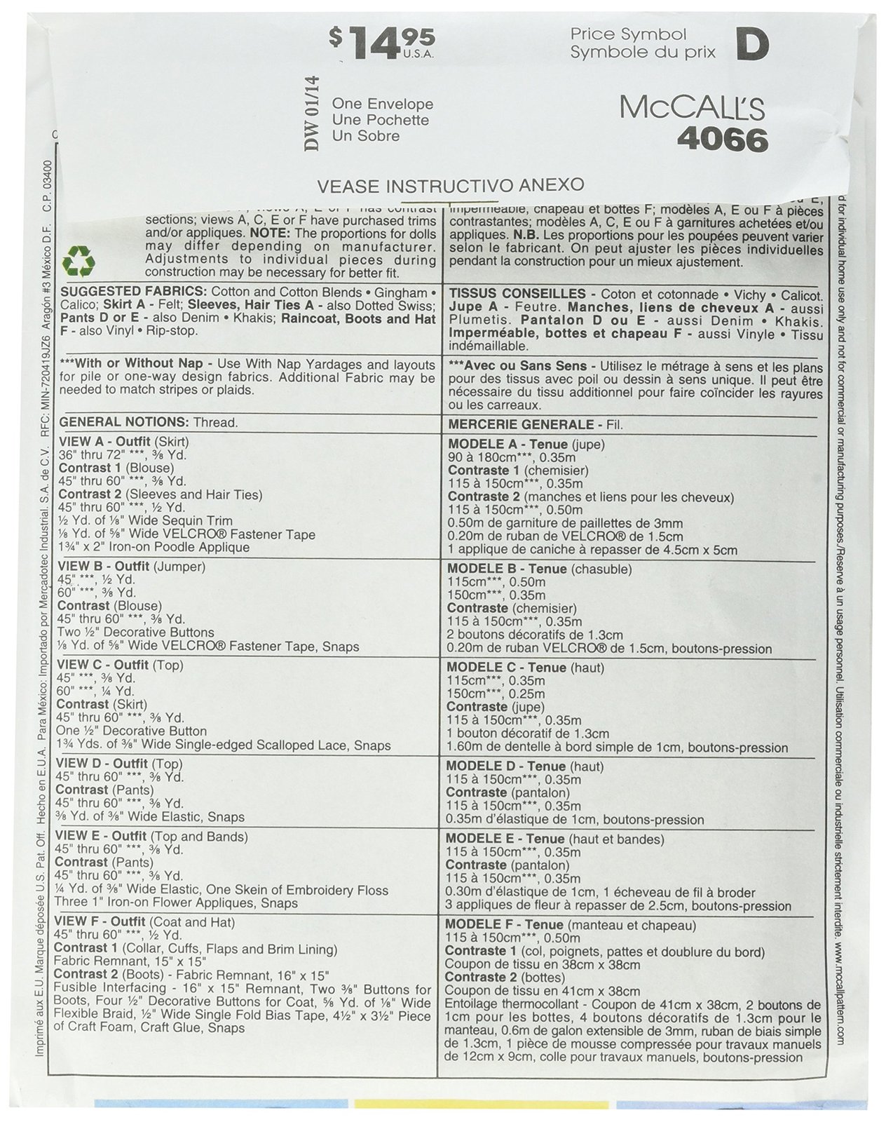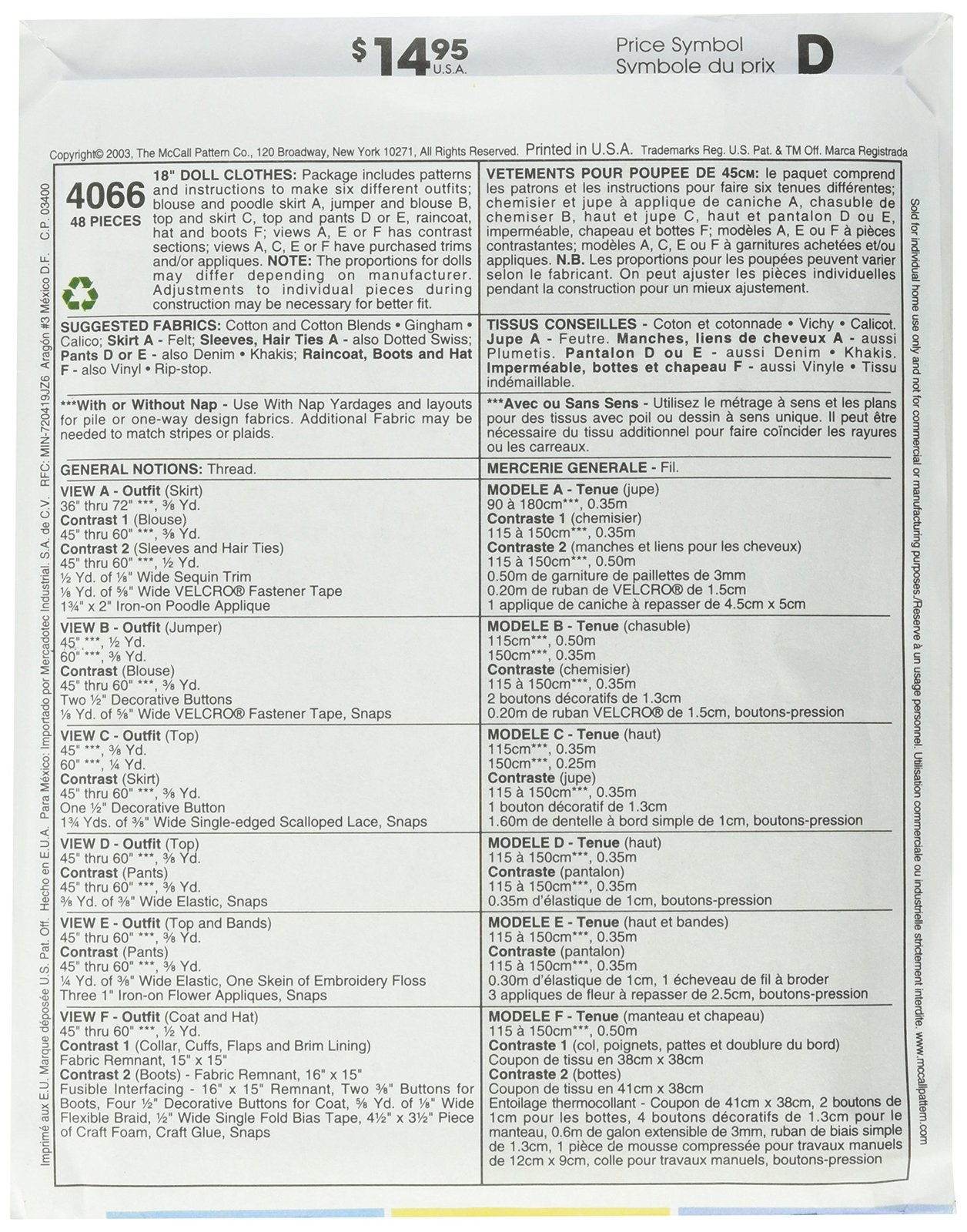 McCall's Patterns M4066 18-Inch Doll Clothes, One Size Only |
