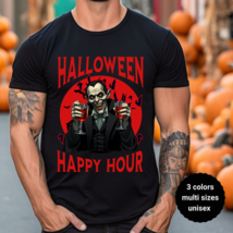 Get into the Halloween spirit with this funny vampire Halloween t-shirt featuring the phrase “Halloween Happy Hour” and a creepy vampire raising two glasses. Perfect for Halloween parties, bar crawls, trick-or-treating, or casual spooky season wear, this tee combines comfort and style with a horror-inspired design that gets noticed.