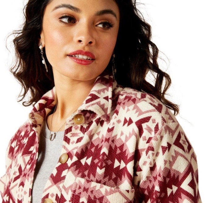 A little warmth, a whole lot of southwestern style. We elevated our soft, super classic shirt jacket with a bold print. Button it up to keep out the cold, or wear it open as part of a layered look.