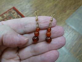 (Internal #EE-447-G) This is a beautiful pair of three bead, dark orange Carnelian gemstone (Brazil) 4, 6, and 8mm round bead, dangle earrings, on gold tone alloy hypoallergenic French wires.