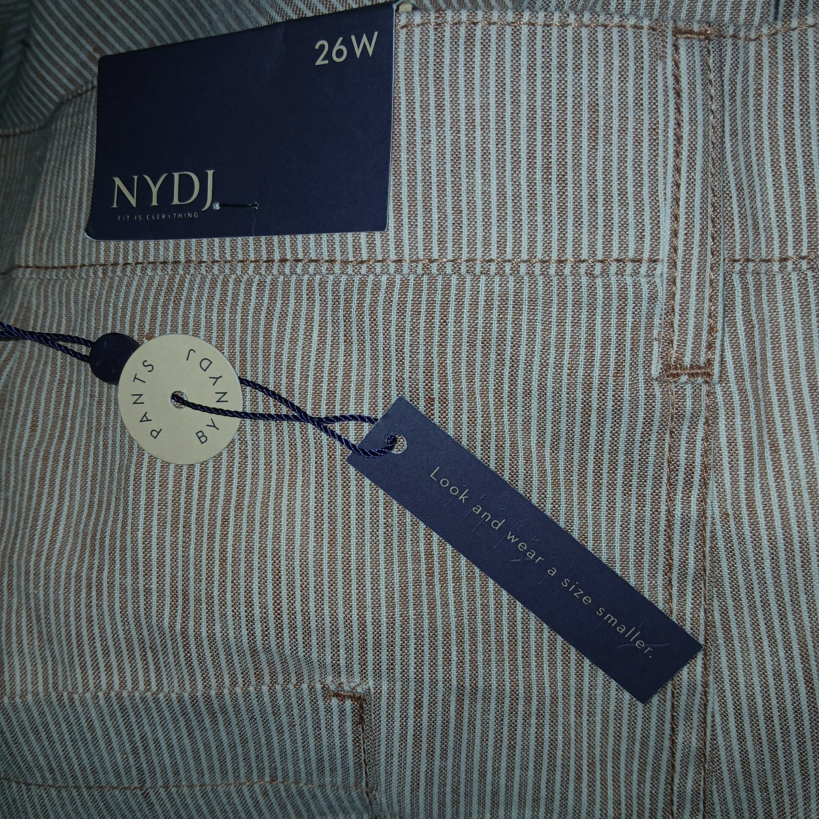 THIS IS A GREAT PAIR OF LADIES NYDJ LIFE TUCK TECHNOLOGY BROWN/WHITE PINSTRIPE PANTS IN A SIZE 26W. THEY ARE NEW, WITH TAGS ATTACHED.