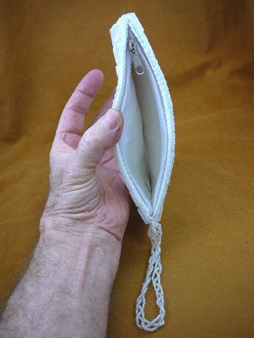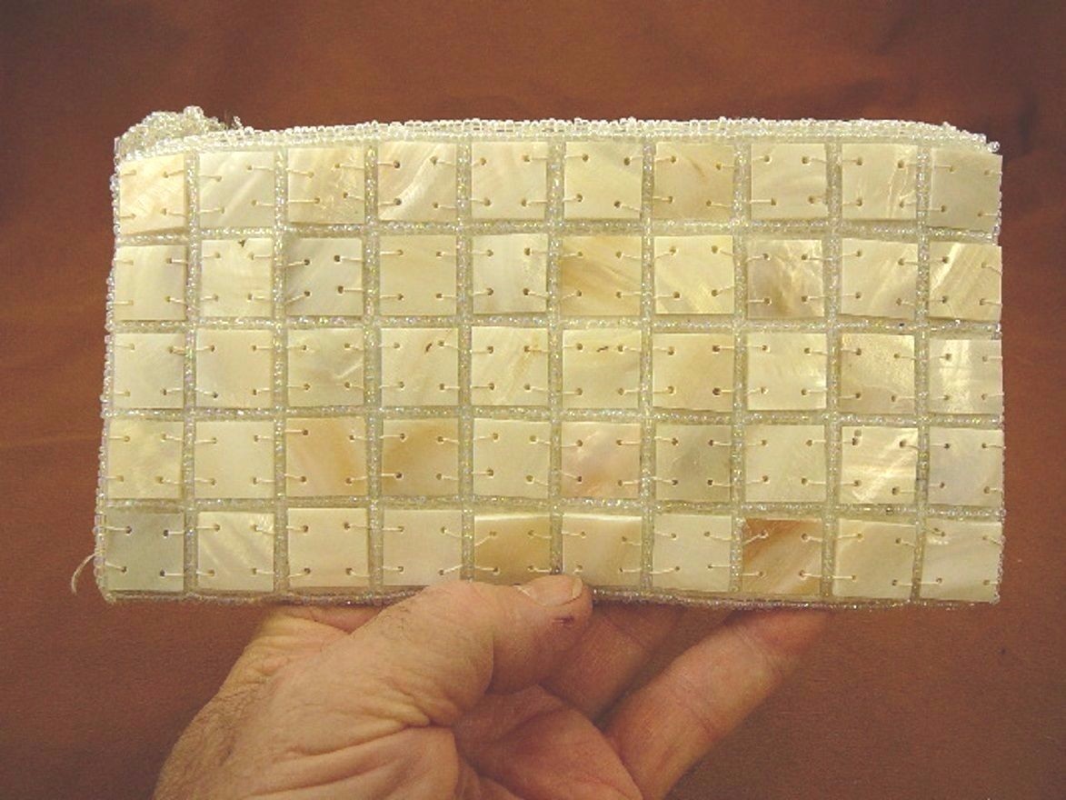 White 3/4? x 3/4? squares of genuine mother of pearl shell, sewn together on an ivory color satin material, lightly padded; edged in clear iridescent beads, ivory satin lined, no compartments.