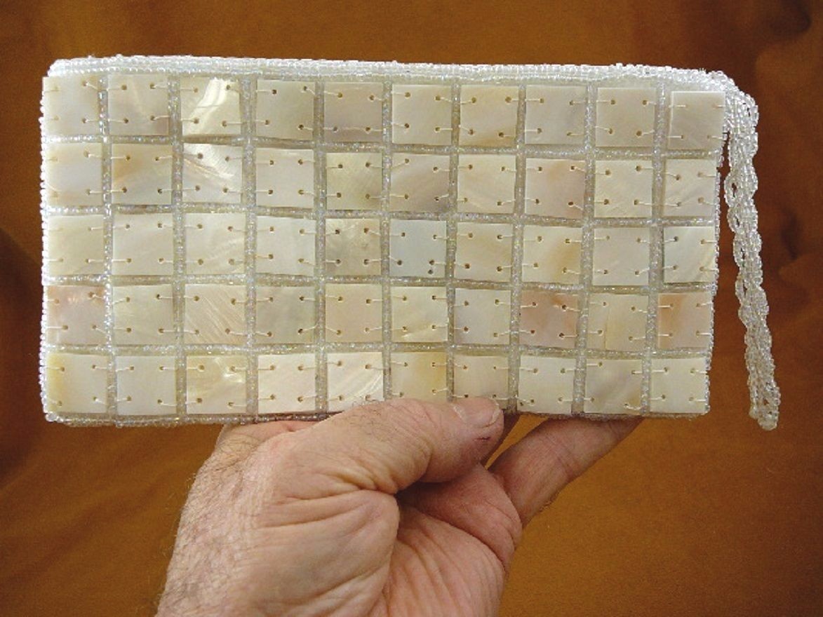 (Internal #EL5-A) This is a new genuine, white MOTHER OF PEARL SHELL Satin CLUTCH Wristlet evening purse.