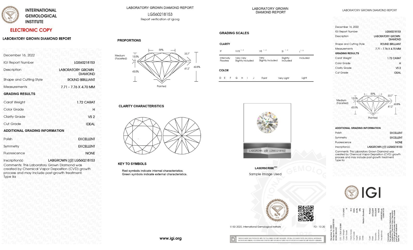 Terms Conditions:Kindly keep this in mind before making your purchase that we are selling our Lab grown diamonds on multiple platforms. The Diamond you receive will be exact color, clarity and cut. The only difference could be the IGI certificate which might differ from the listed stone. We highly appreciate your cooperation.LabIGIReport #-ShapeRoundCarat2.57ColorHClarityVS2CutIdealPolishExcellentSymExcellentFluorNoneLocationNew York, United StatesDepth60.8%Table57%GirdleMedium - FACETEDCrown14.5%, 34.2Pavillion40.7%, 43.0CuletNoneMeas8.83 x 8.86 x 5.38Ratio-BGMNoneGrowth TypeCVDPlease note that we are listing all of our stone's color clarity grade as per IGI Lab Report. IGI Lab is the 2nd most reputable trustworthy Lab after GIA. Every person can have a different opinion about the color clarity of the stone. So the stones you are getting can be h to j in color vs2 to si2 in clarity grades as per GIA standards but as IGI standards those are as mentioned in the listing. how practical it is to use $75000 (3 Carat E VS!) Natural Diamond stone standard for the same color clarity grade (3 Carat EVS1) Lab Grown Stone which you are getting for $750. My advice to you is whatever authenticity says please please get the stone if you do not like then I will accept the return without any question in the next 30 days of purchase. I don't want you to miss the great opportunity to buy those beautiful lab grown stones which are 100% the same chemical other properties wise as natural Diamonds at 1% of price compared to Natural Diamond.