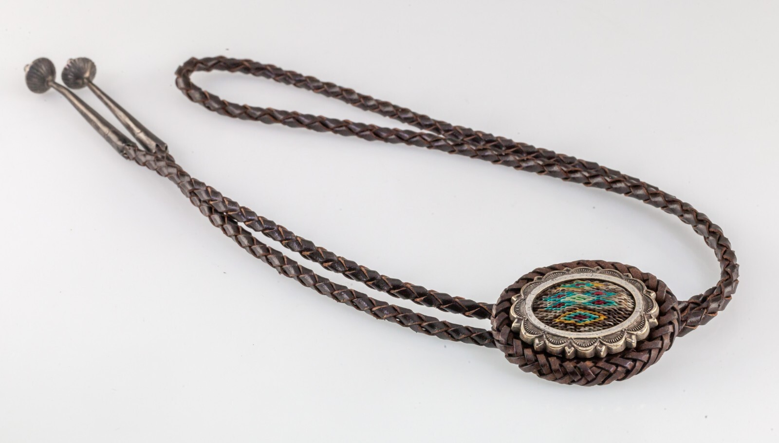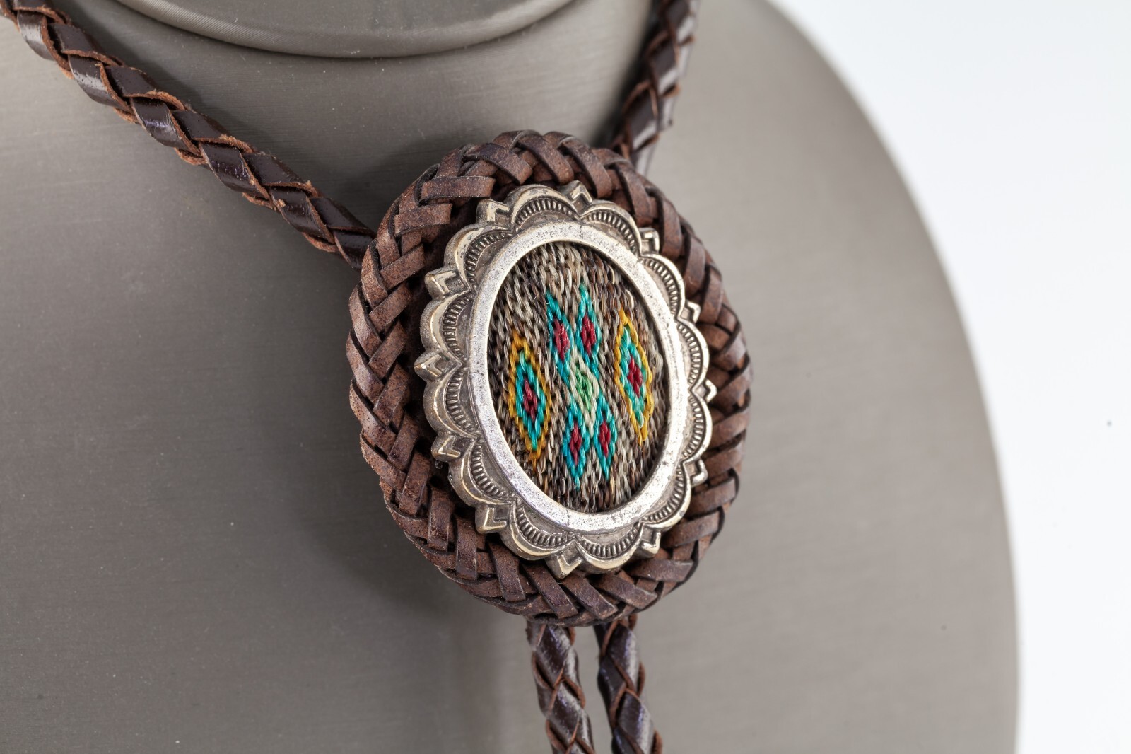 Comprend un bolo unique avec plaque en cuir, une bordure en cuir tressee et une lunette argentee autour de la piece maîtresse tissee