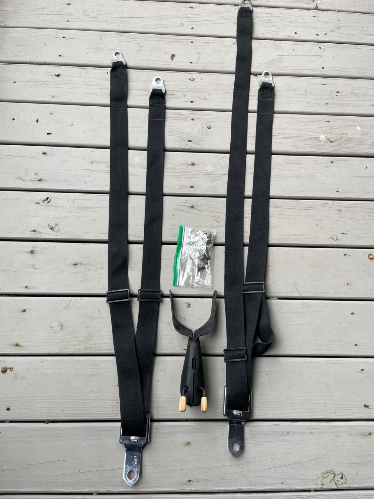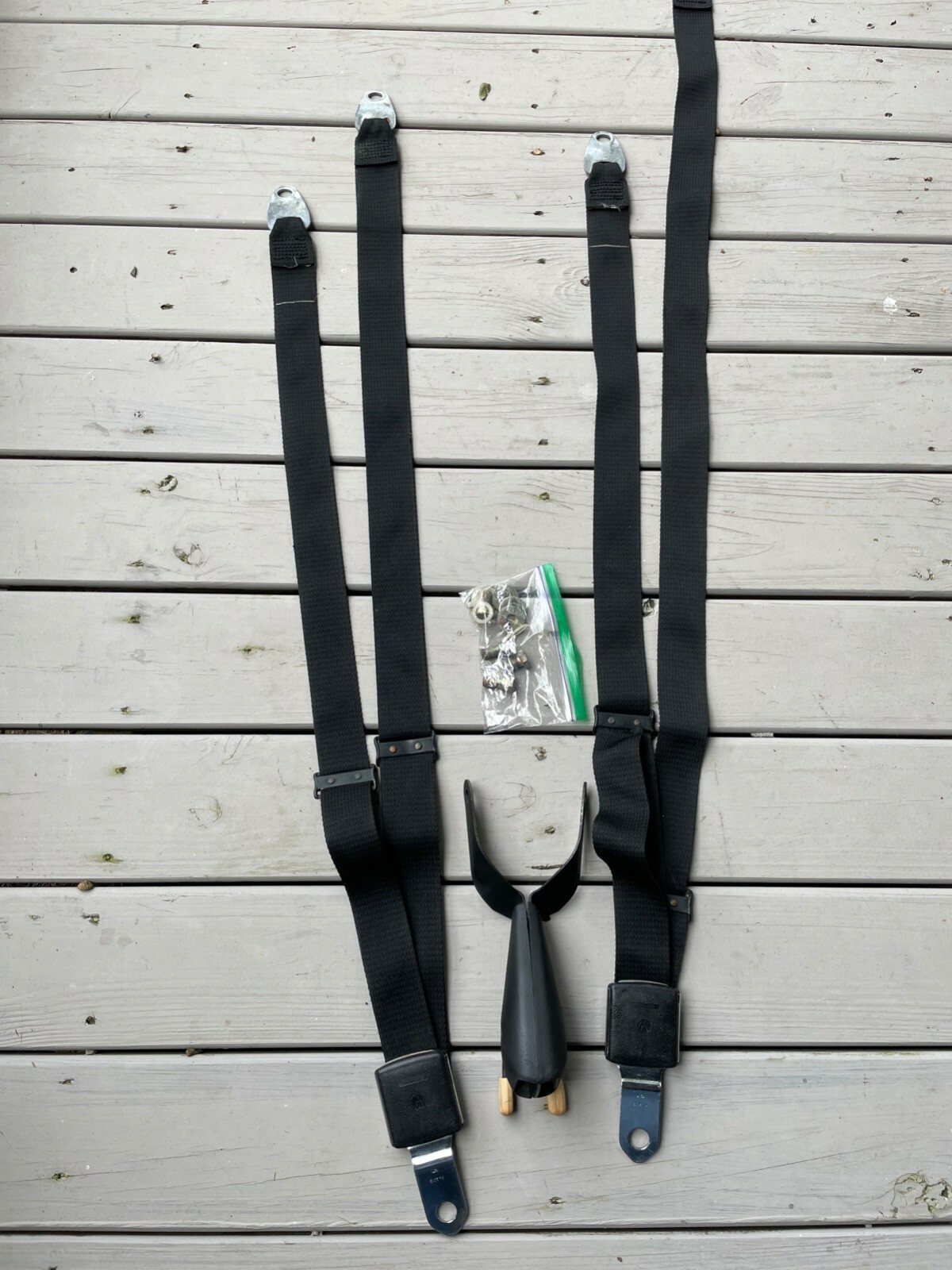 VW Beetle 1968-1971 front Seat Belt set. Lap/Shoulder Strap, Receiver, Bolts